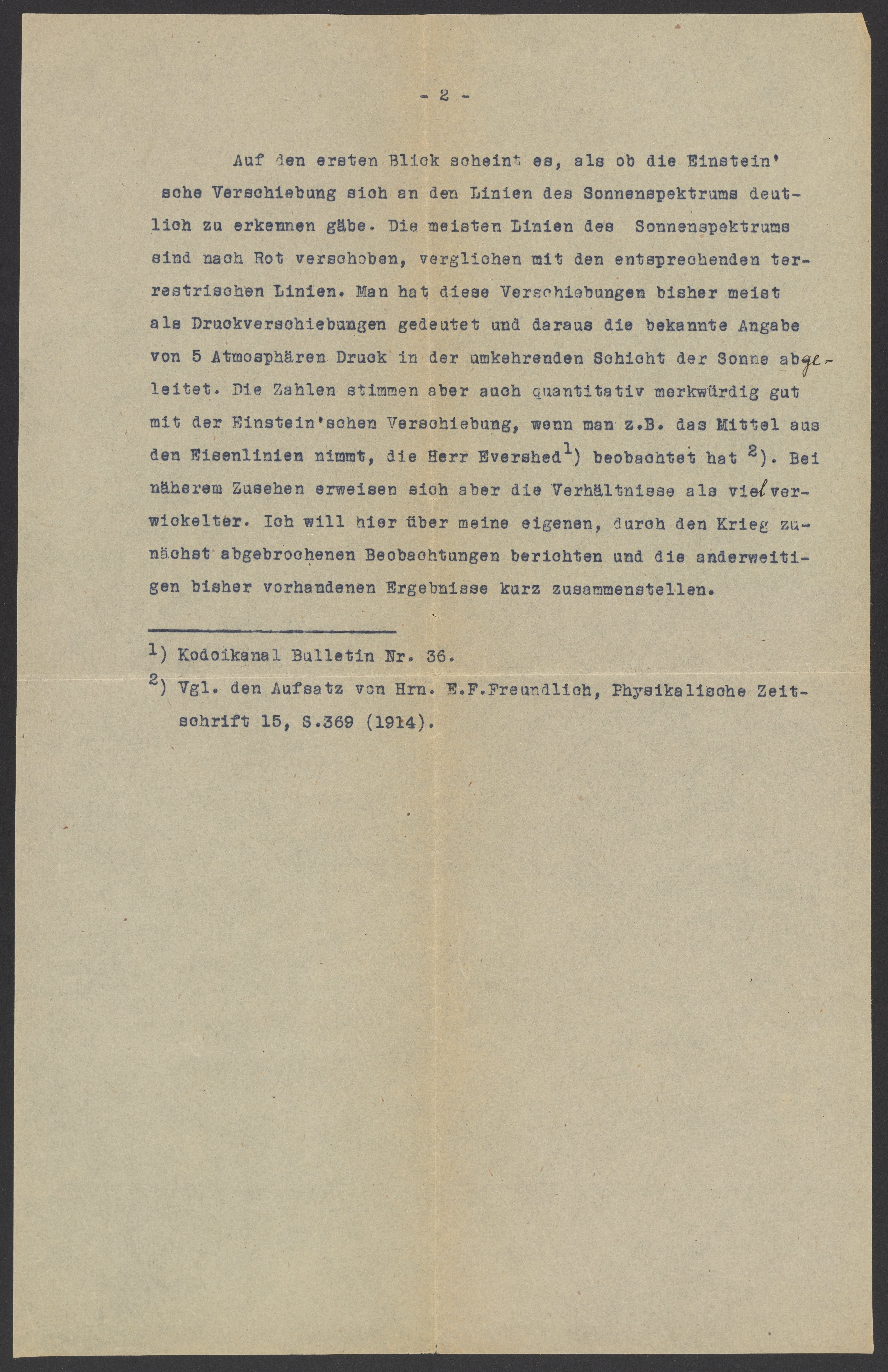 At first glance, it seems that Einstein’s shift is clearly visible in the lines of the solar spectrum. Most lines of the solar spectrum are red shifted when compared to the corresponding terrestrial lines. So far, these shifts have mostly been interpreted as pressure shifts and as a result, the well-known definition of 5 atmospheres of pressure in the reverse layer of the sun has been derived. However, quantitatively, the figures also agree remarkably well with Einstein’s shift, if one considers for example, the substance from the iron lines that Mr. Evershed 1) has observed 2). On closer inspection, however, the situation turns out to be much more complicated. I would to report here on my own observations, which were initially interrupted by the war, and briefly summarize the other results available so far.