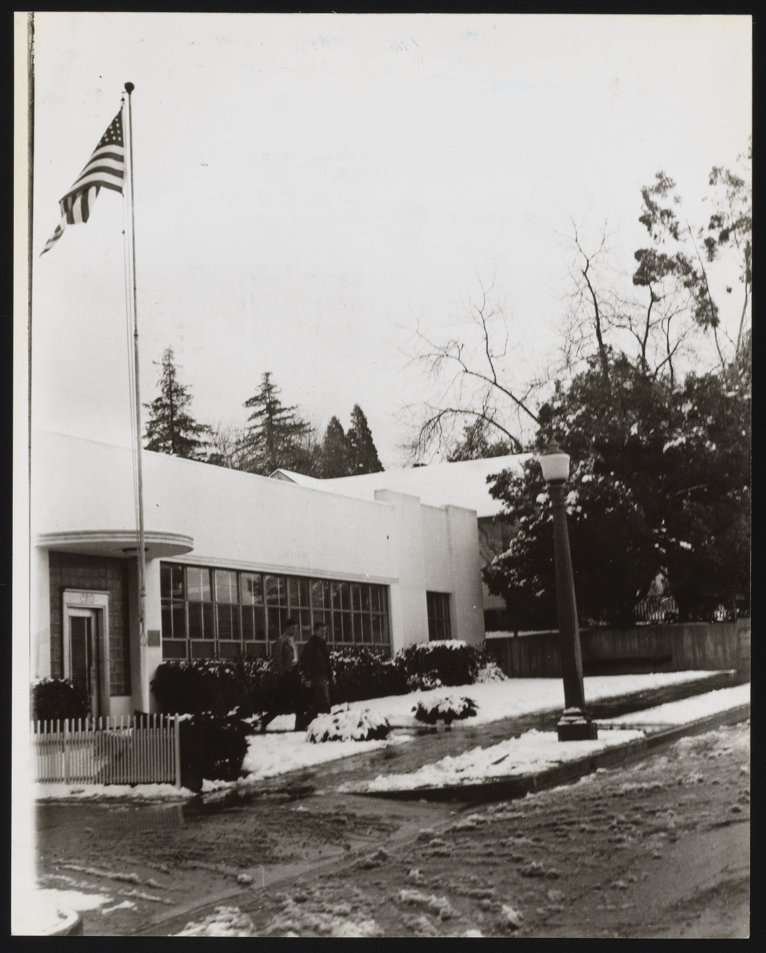 Rohrer, Larry. “Front Entrance of National Technical Laboratories.” National Technical Laboratories in Winter, 1948. Beckman Historical Collection, Box 55, Folder 93. Science History Institute. Philadelphia. https://digital.sciencehistory.org/works/jh343s559.