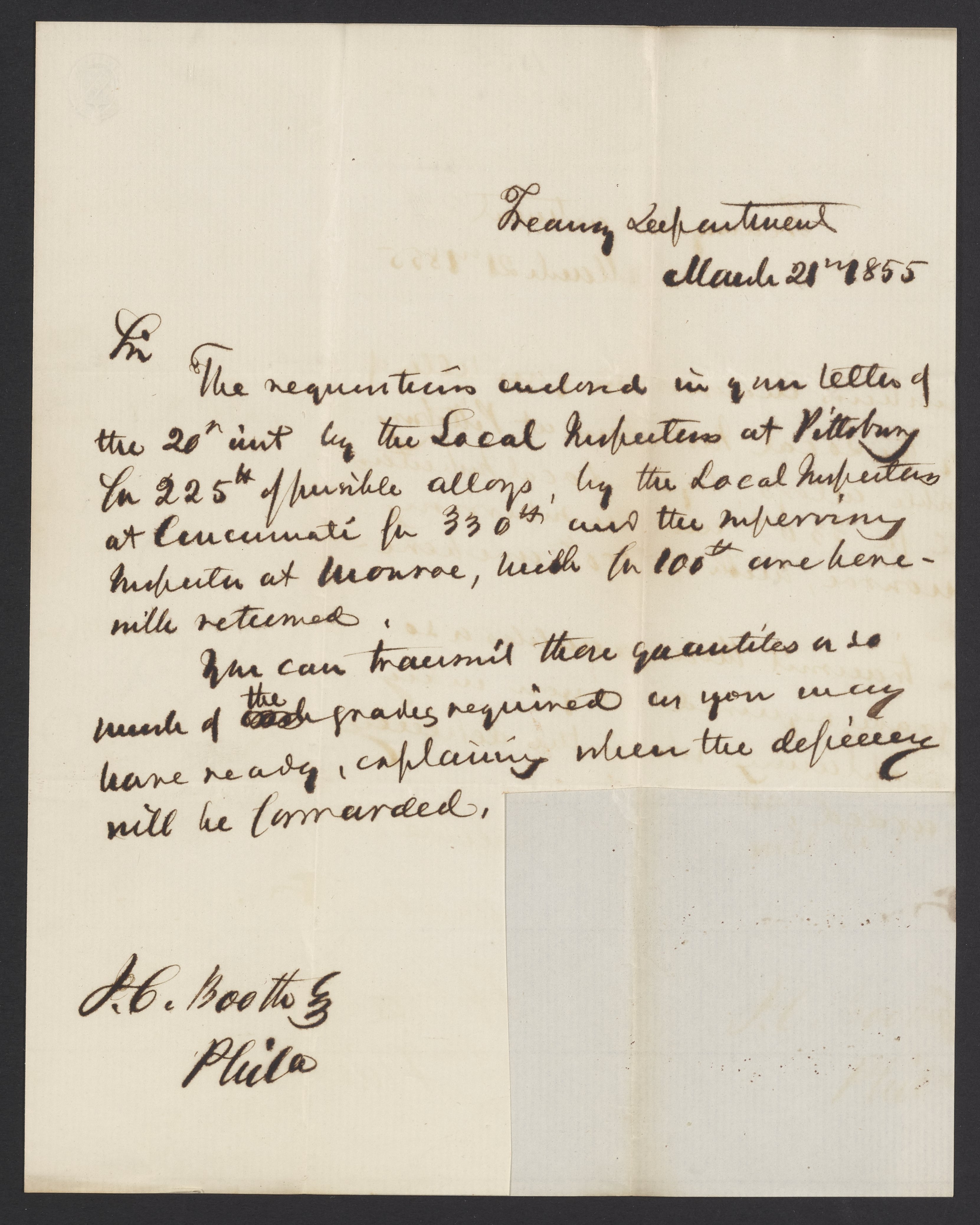 Small JPG1200 x 1501px — 218 KBLarge JPG2880 x 3601px — 1.1 MBFull-sized JPG3322 x 4154px — 1.5 MBOriginal fileTIFF — 3322 x 4154px — 39.5 MBJames B. Guthrie (1792 - 1869), United States Secretary of the Treasury from 1853-1857, writes to James Curtis Booth (1810-1888) concerning authorization to ship quantities of fusible alloys to Pittsburgh, Cincinnati and Monroe. Guthrie's signature has been cut away.