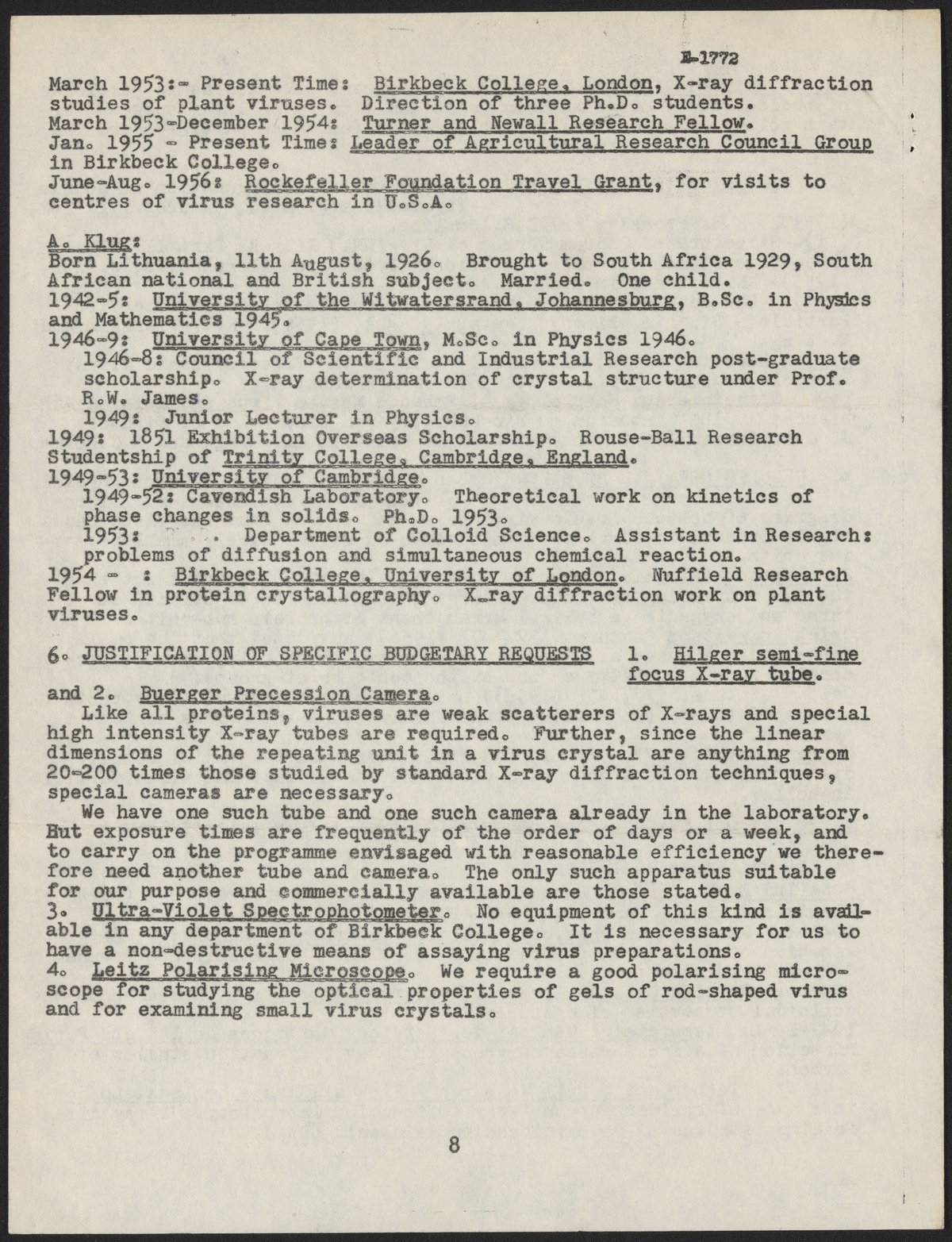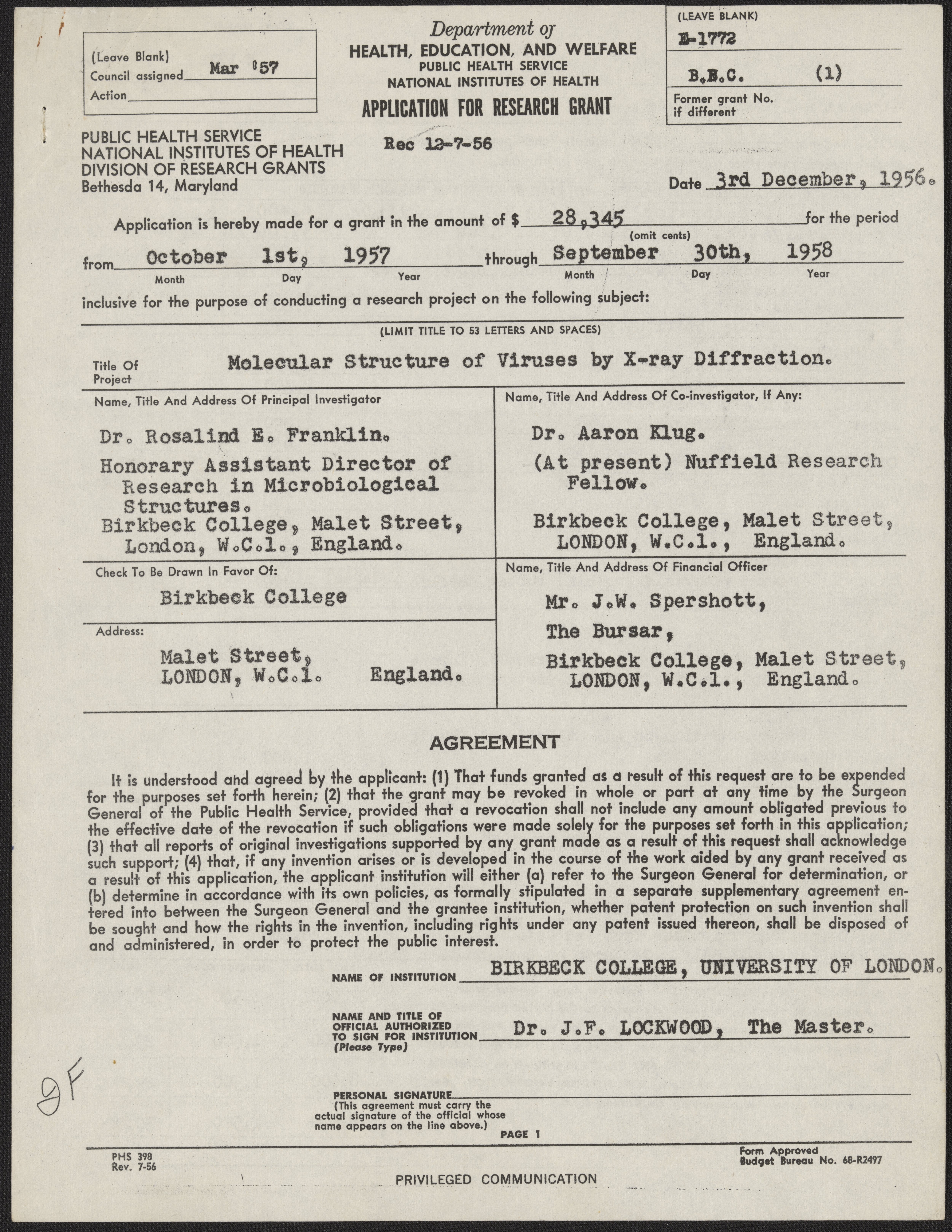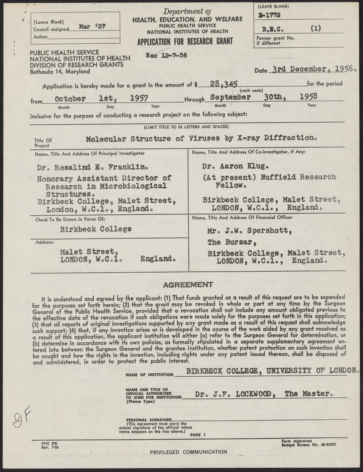 Small JPG1200 x 1559px — 362 KBLarge JPG2880 x 3742px — 1.8 MBFull-sized JPG4994 x 6488px — 5.0 MBOriginal fileTIFF — 4994 x 6488px — 92.7 MBTwo copies of a grant application for funding to study the molecular structure of viruses using X-ray diffraction, filled out by Rosalind Franklin (1920-1958) and Aaron Klug (1926-2018), and submitted to the National Institutes of Health.
