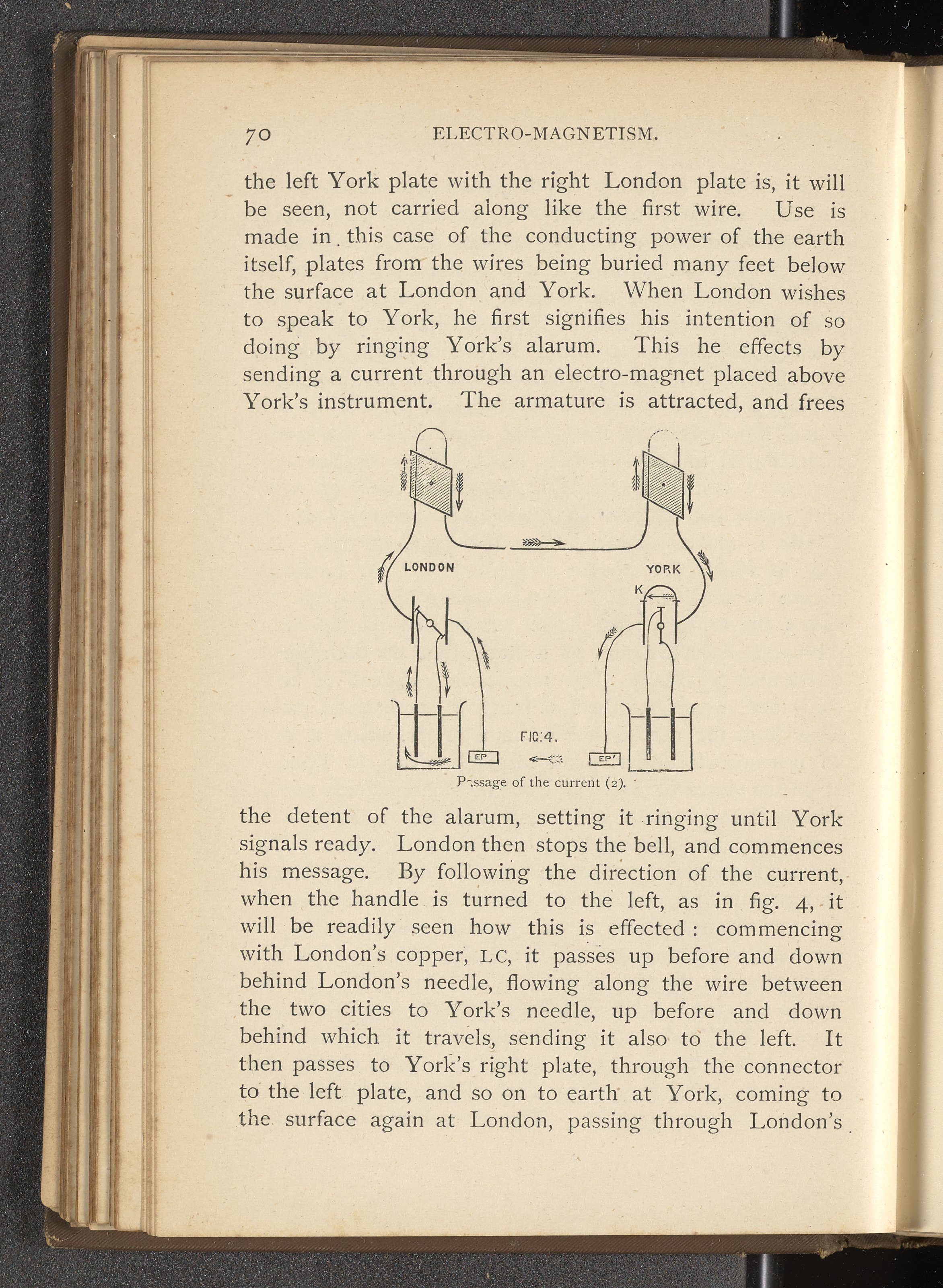 Diagram depicting the passage of current between the cities of London and York in a needle telegraph system. One of the two main types of electromagnetic telegraphs, needle telegraphs use indicating needles moved electromagnetically as a means of displaying messages.