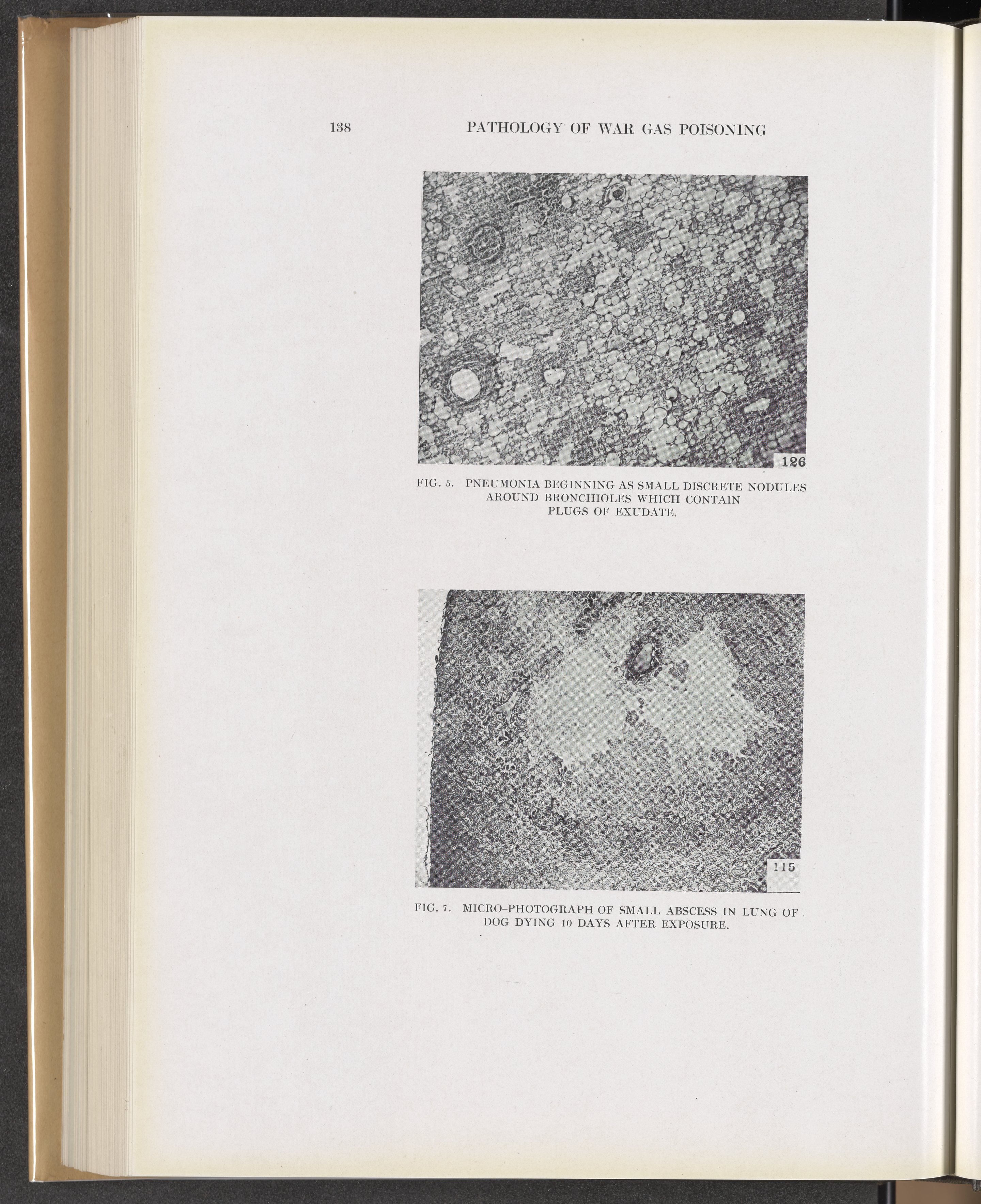Winternitz, M. C. (Milton C.). “Fig. 5: Pneumonia Beginning as Small Discrete Nodules around Bronchioles Which Contain Plugs of Exudate. Fig. 7: Micro-Photograph of Small Abscess in Lung of Dog Dying 10 Days after Exposure.” Collected Studies on the Pathology of War Gas Poisoning. New Haven, Connecticut: Yale University Press, 1920. https://digital.sciencehistory.org/works/jm214p31z.
