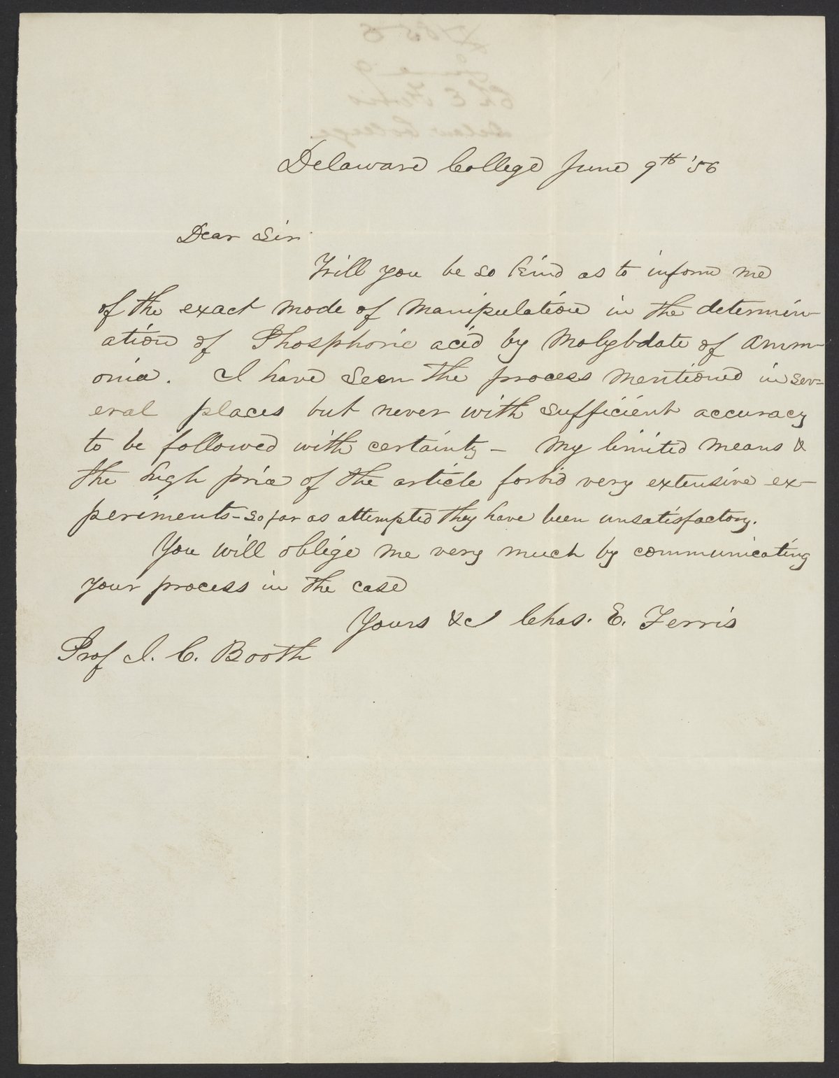 Ferris, Charles. “Letter from Charles Ferris to James Curtis Booth, June 9, 1856,” June 9, 1856. Papers of James Curtis Booth, Box 1, Folder 7. Science History Institute. Philadelphia. https://digital.sciencehistory.org/works/jmo5yle.