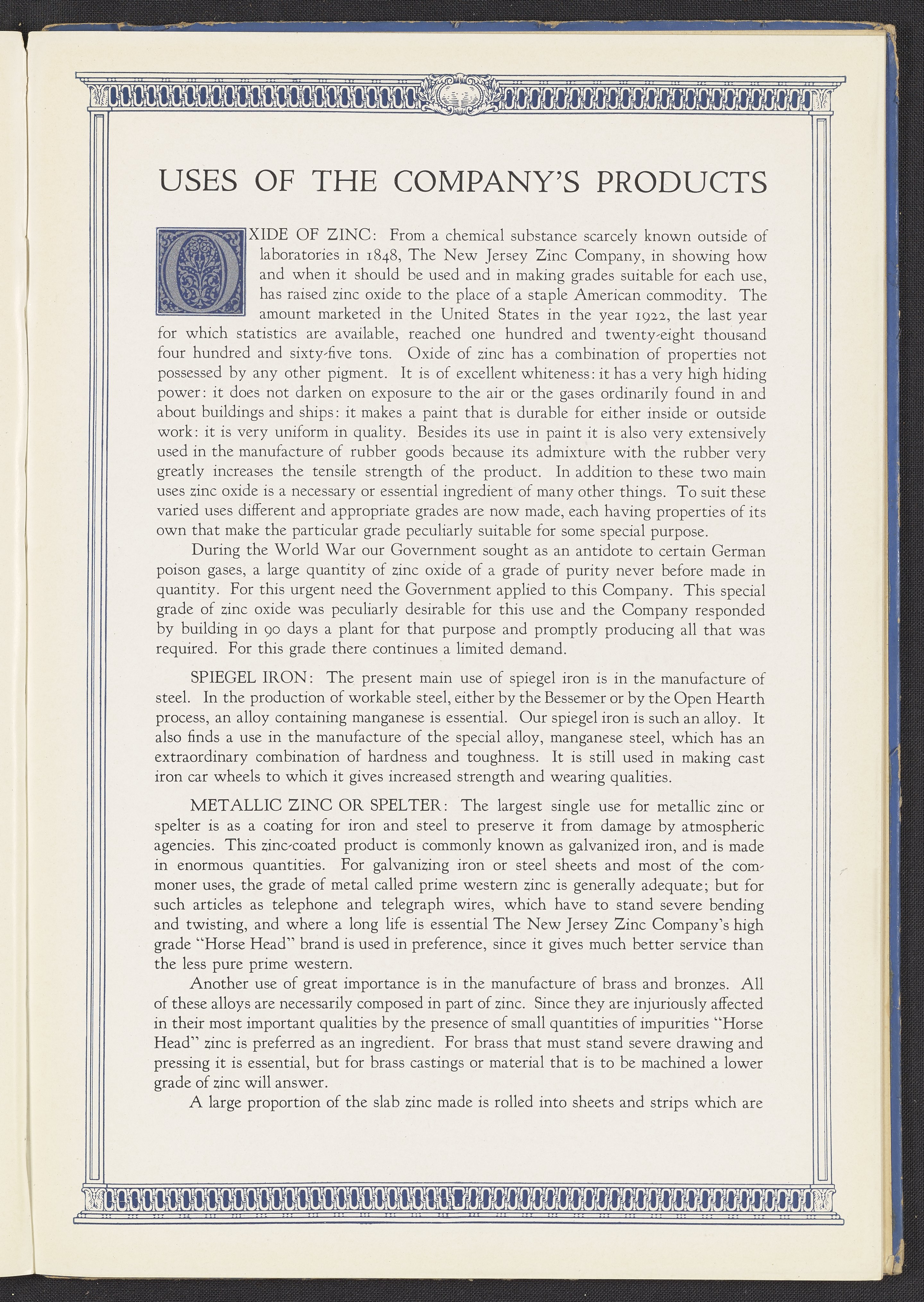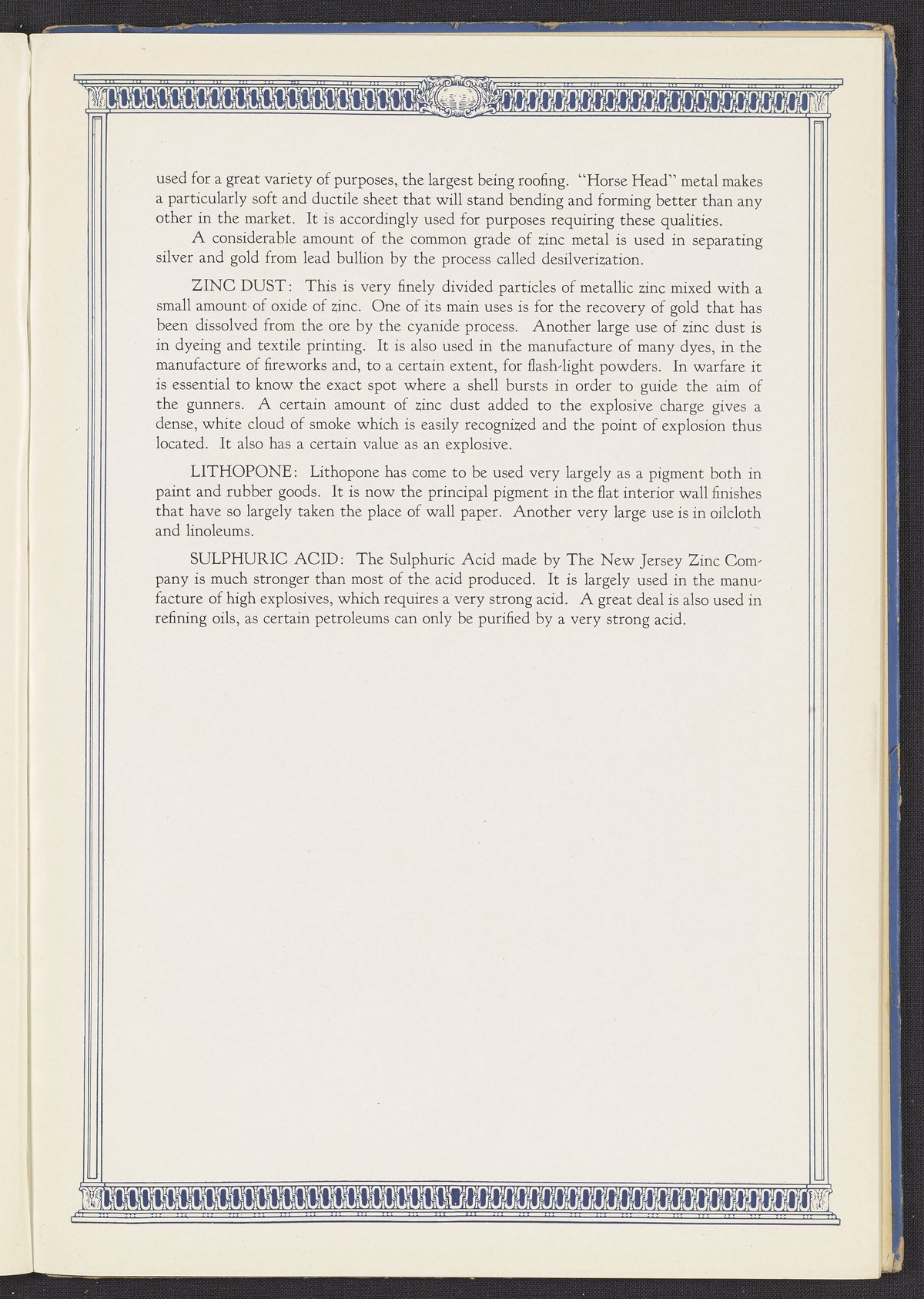 Small JPG1200 x 1652px — 278 KBLarge JPG2880 x 3966px — 1.6 MBFull-sized JPG3740 x 5150px — 2.5 MBOriginal fileTIFF — 3740 x 5150px — 55.2 MBA corporate history of the New Jersey Zinc Company, thoroughly illustrated with black and white photographic prints. The New Jersey Zinc Company (now the Horsehead Holding Corporation), founded in 1848 in Pittsburgh Pennsylvania, was the largest producer of Zinc in the United States from 1897 to 1966. The work is digitized in its entirety.
