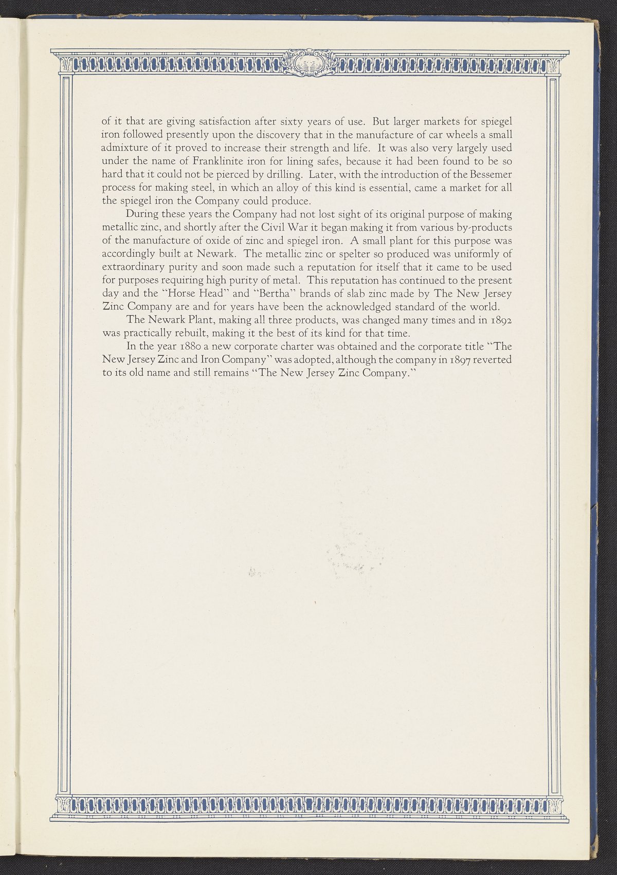 Small JPG1200 x 1652px — 278 KBLarge JPG2880 x 3966px — 1.6 MBFull-sized JPG3740 x 5150px — 2.5 MBOriginal fileTIFF — 3740 x 5150px — 55.2 MBA corporate history of the New Jersey Zinc Company, thoroughly illustrated with black and white photographic prints. The New Jersey Zinc Company (now the Horsehead Holding Corporation), founded in 1848 in Pittsburgh Pennsylvania, was the largest producer of Zinc in the United States from 1897 to 1966. The work is digitized in its entirety.