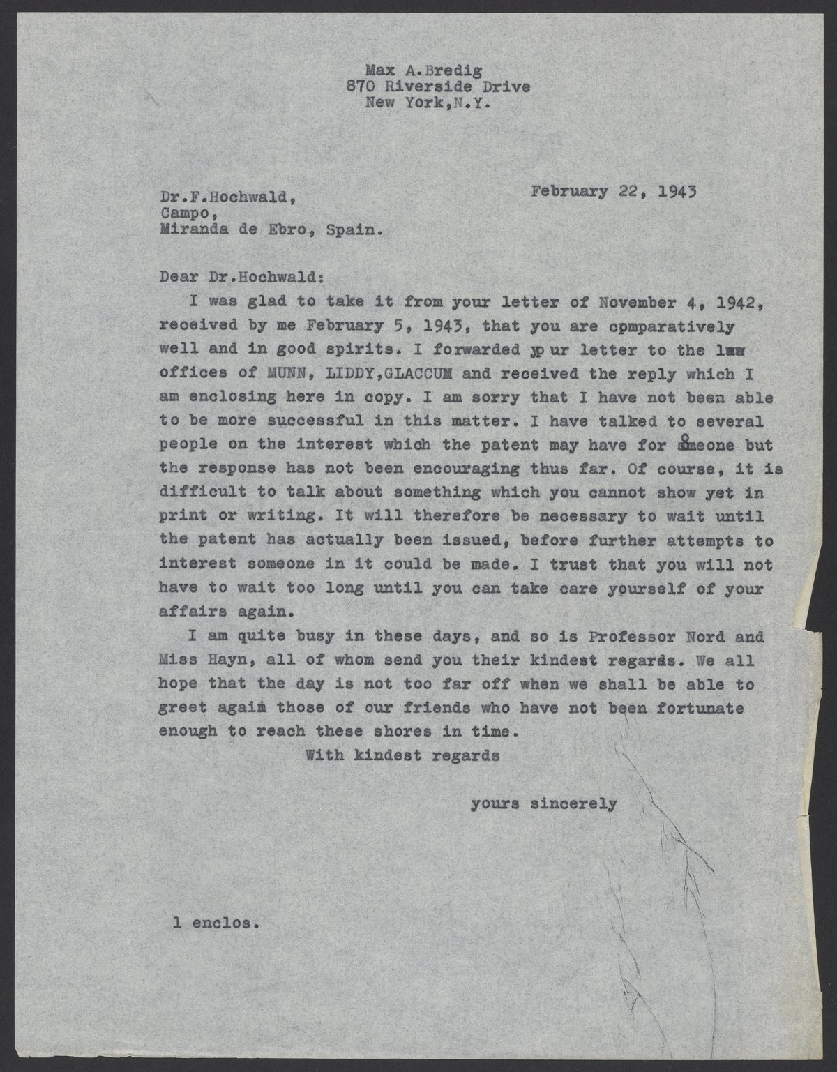 Unsigned letter from Max Bredig to Fritz Hochwald, February 22, 1943