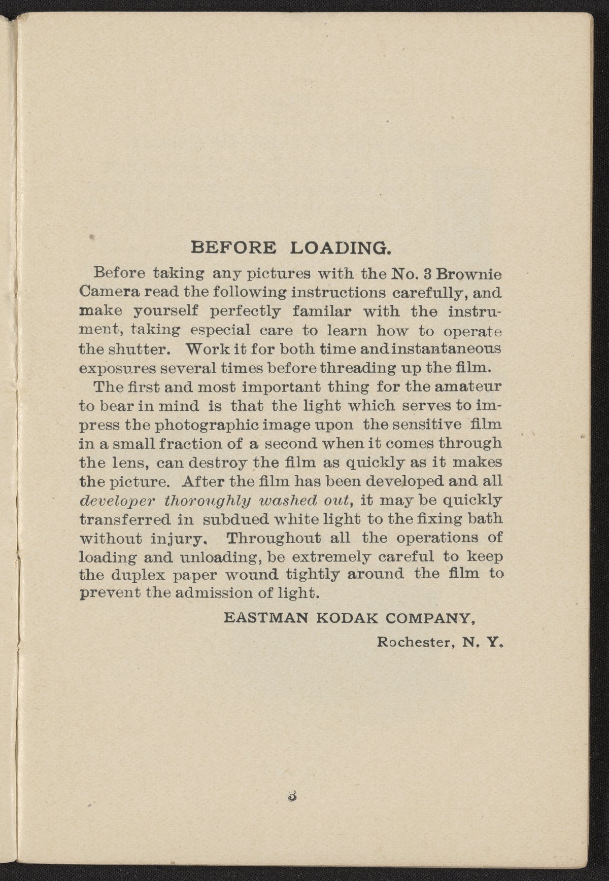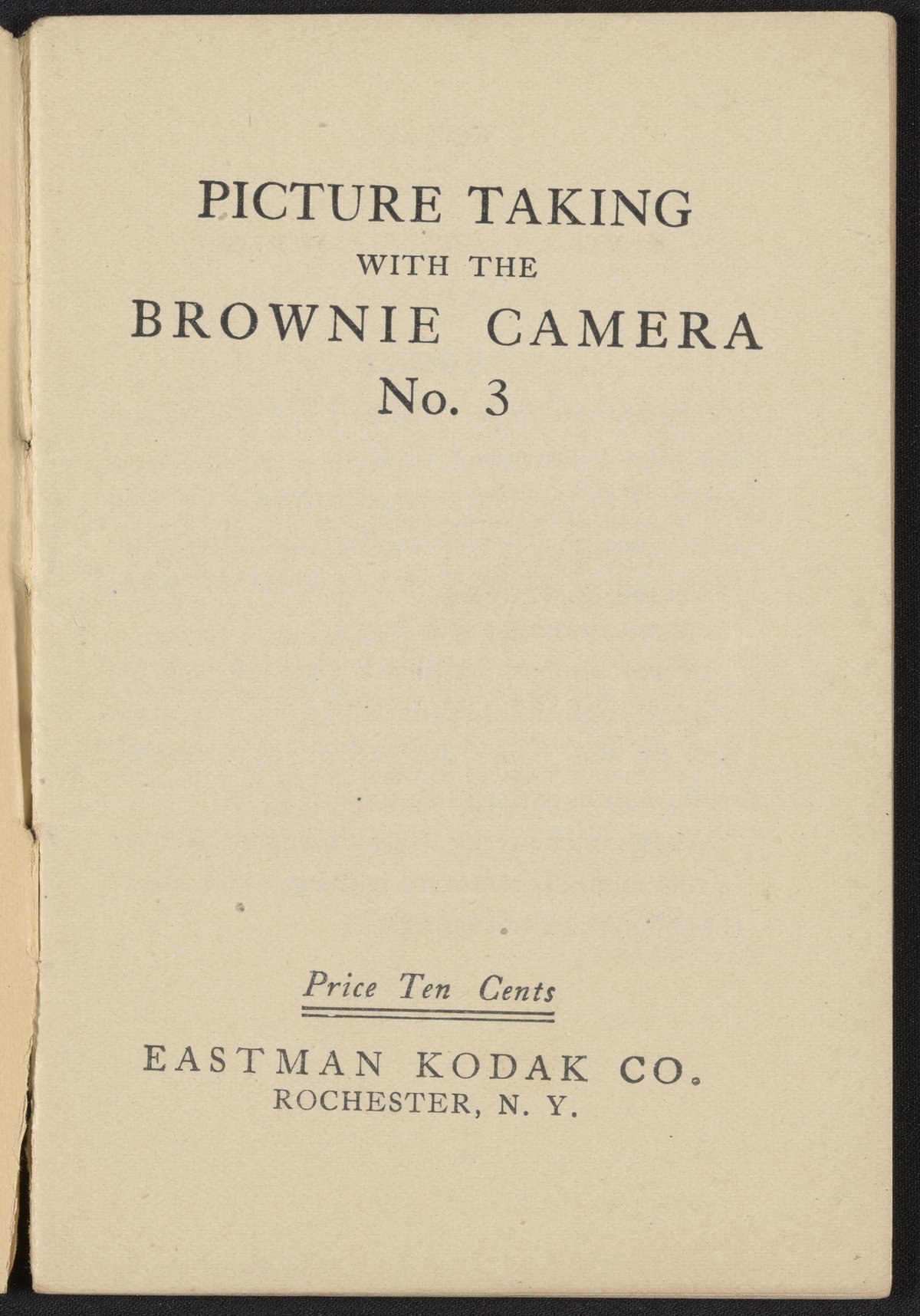 Small JPG1200 x 1725px — 438 KBFull-sized JPG2200 x 3162px — 1.3 MBOriginal fileTIFF — 2200 x 3162px — 19.9 MBPamphlet titled Picture Taking with the Brownie Camera No. 3. This 1909 publication provides detailed instructions on using a Brownie camera, including loading film, taking a picture, developing the film, and printing images using Velox paper.