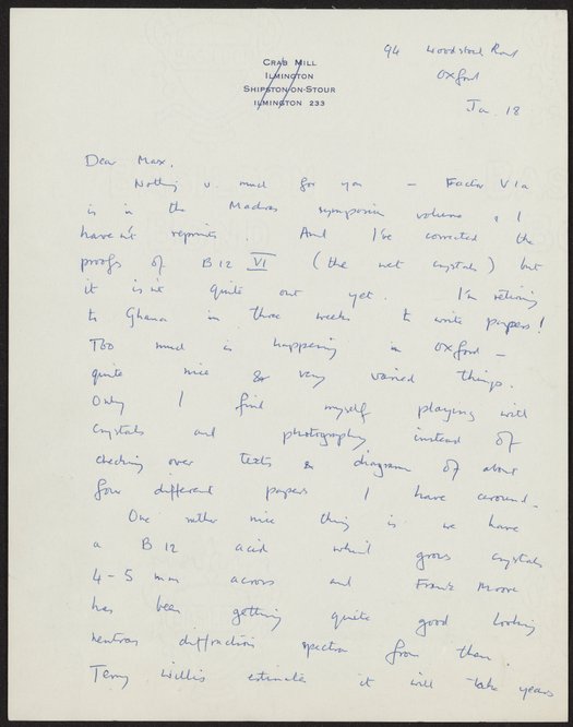 Letter from Dorothy Hodgkin to Max Perutz, January 18