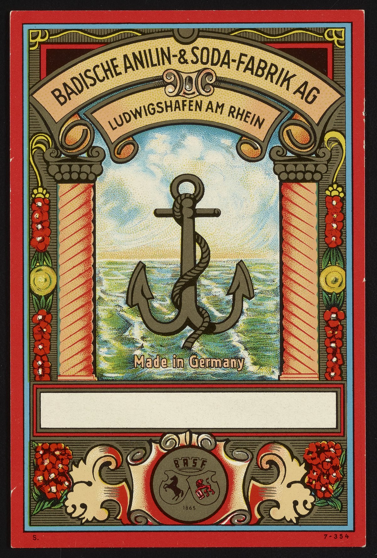 Dye label depicts an anchor in front of a body water with cresting waves. Illustration is surrounded by an elaborate border with the Badische Anilin & Soda-Fabrik (BASF) trademark insignia.