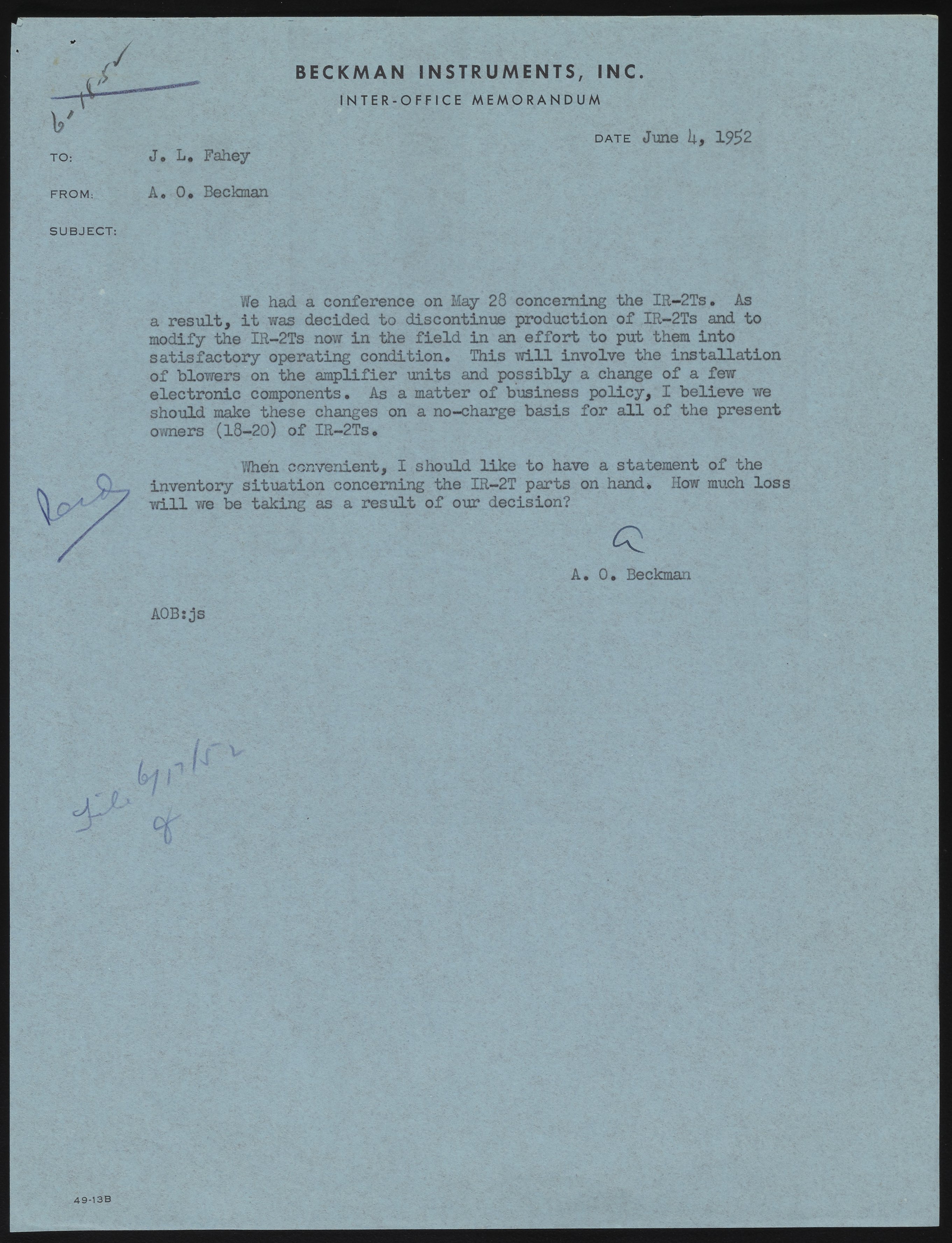 Memo from Arnold Beckman regarding Beckman Instruments discontinuing the IR-2T spectrophotometer, which had serious flaws only discovered after the instrument had shipped to early buyers. Beckman announces that the instruments currently in the field will be upgraded at no charge to the owner.