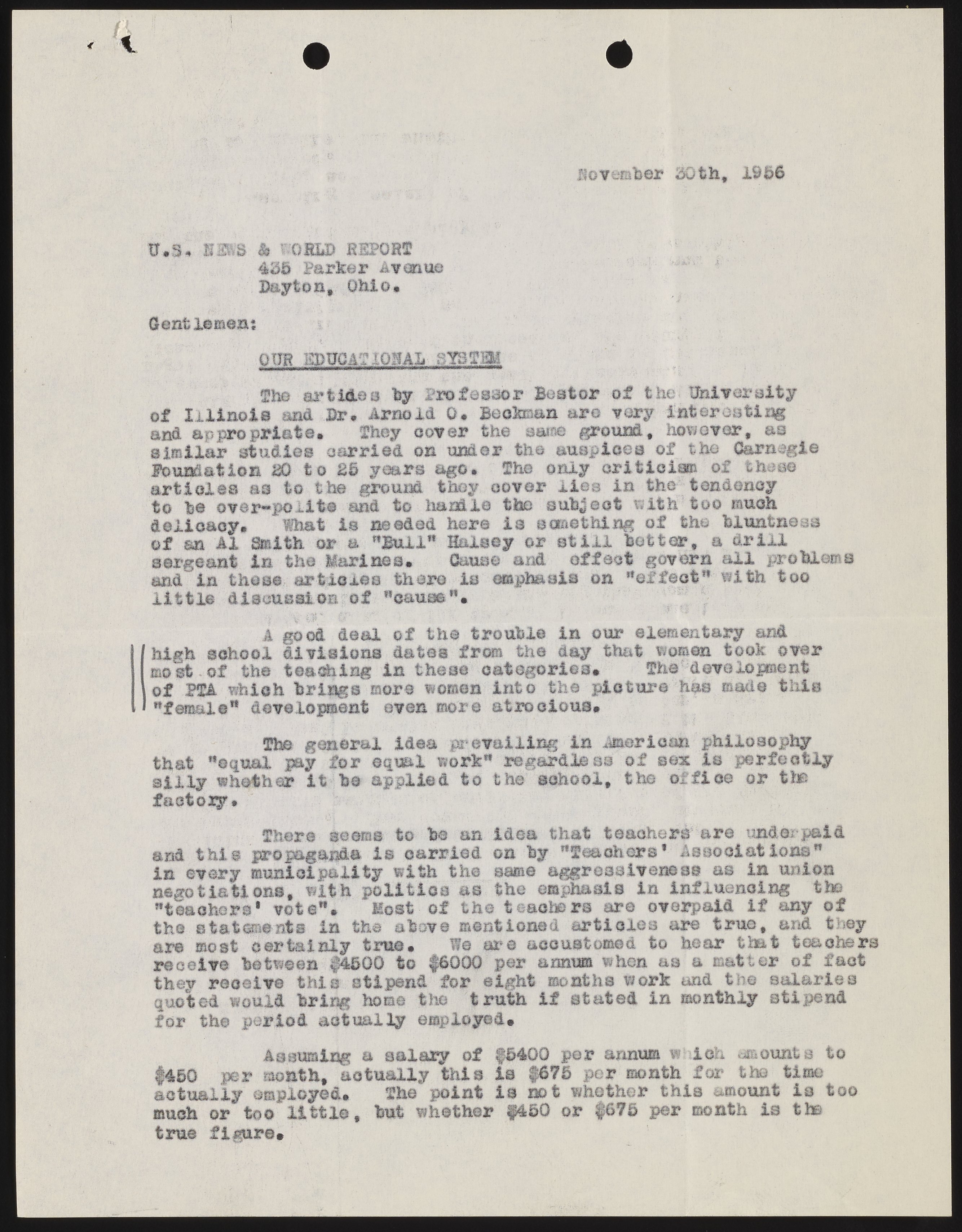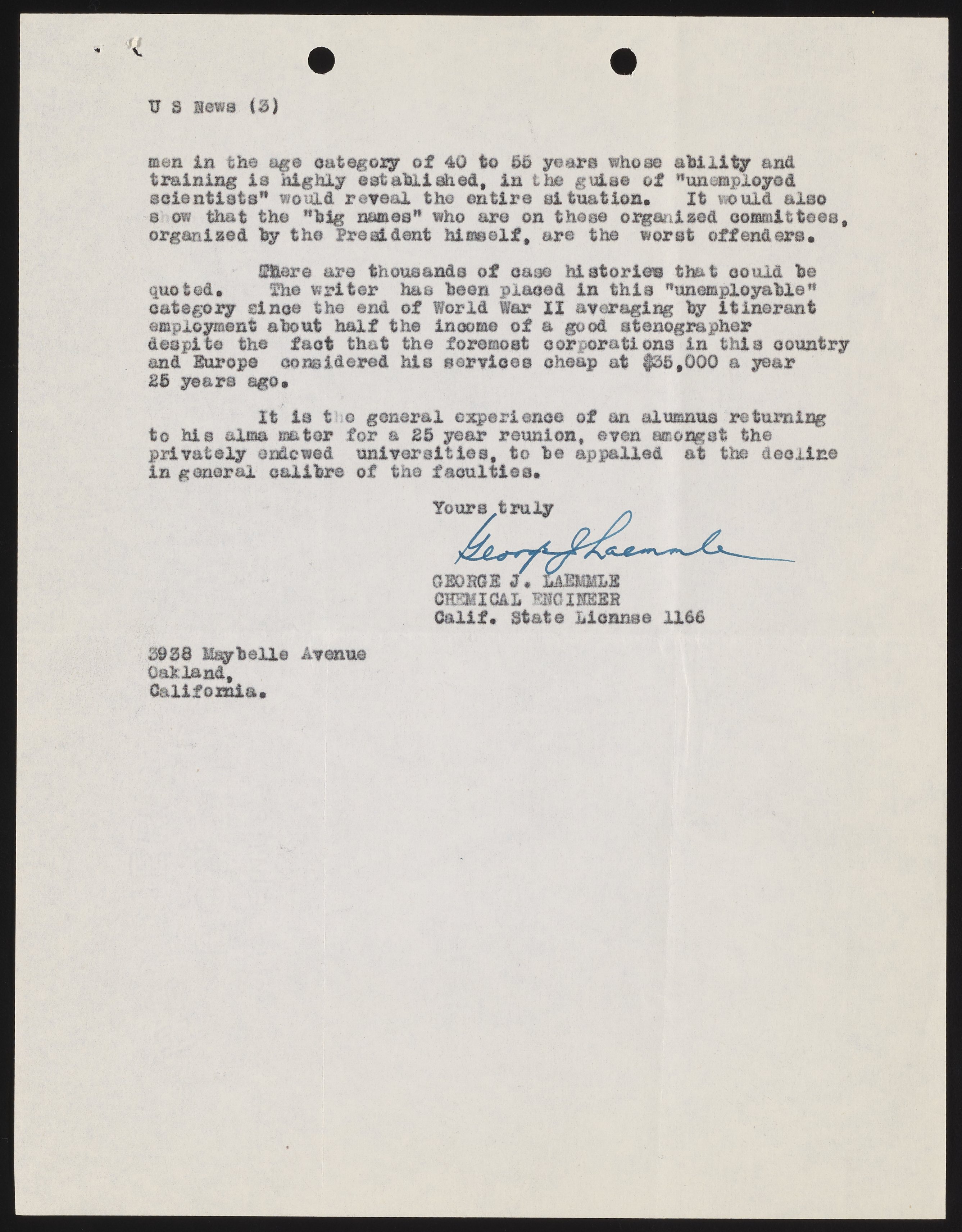 Letter from George J. Laemmle to U.S. News & World Report
