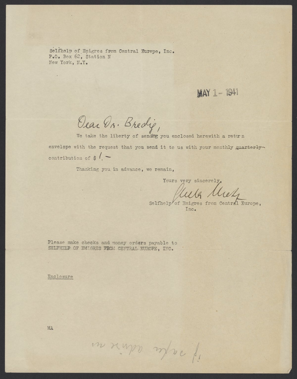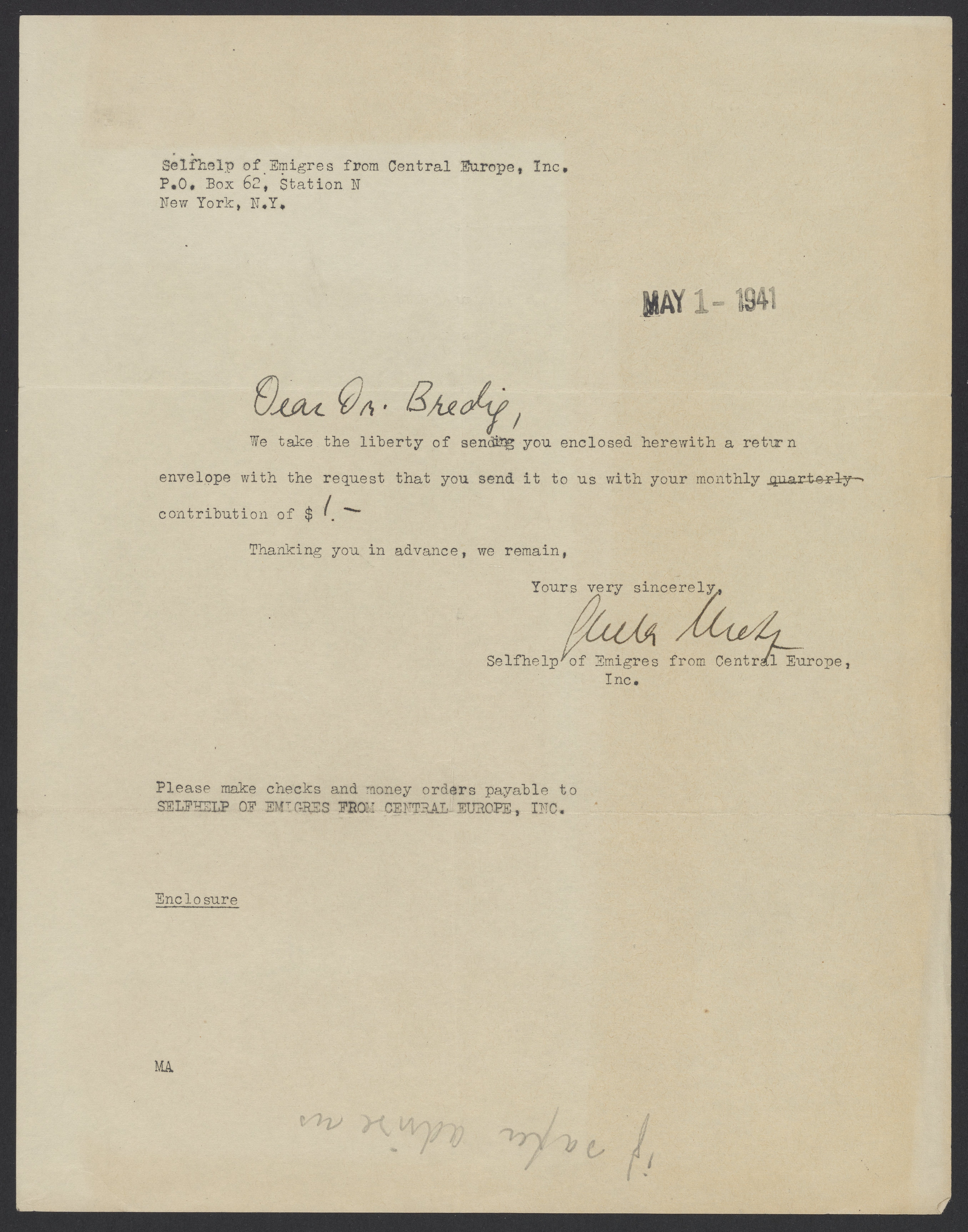 Letter from SelfHelp of Emigres from Central Europe to Max Bredig, May 1, 1941