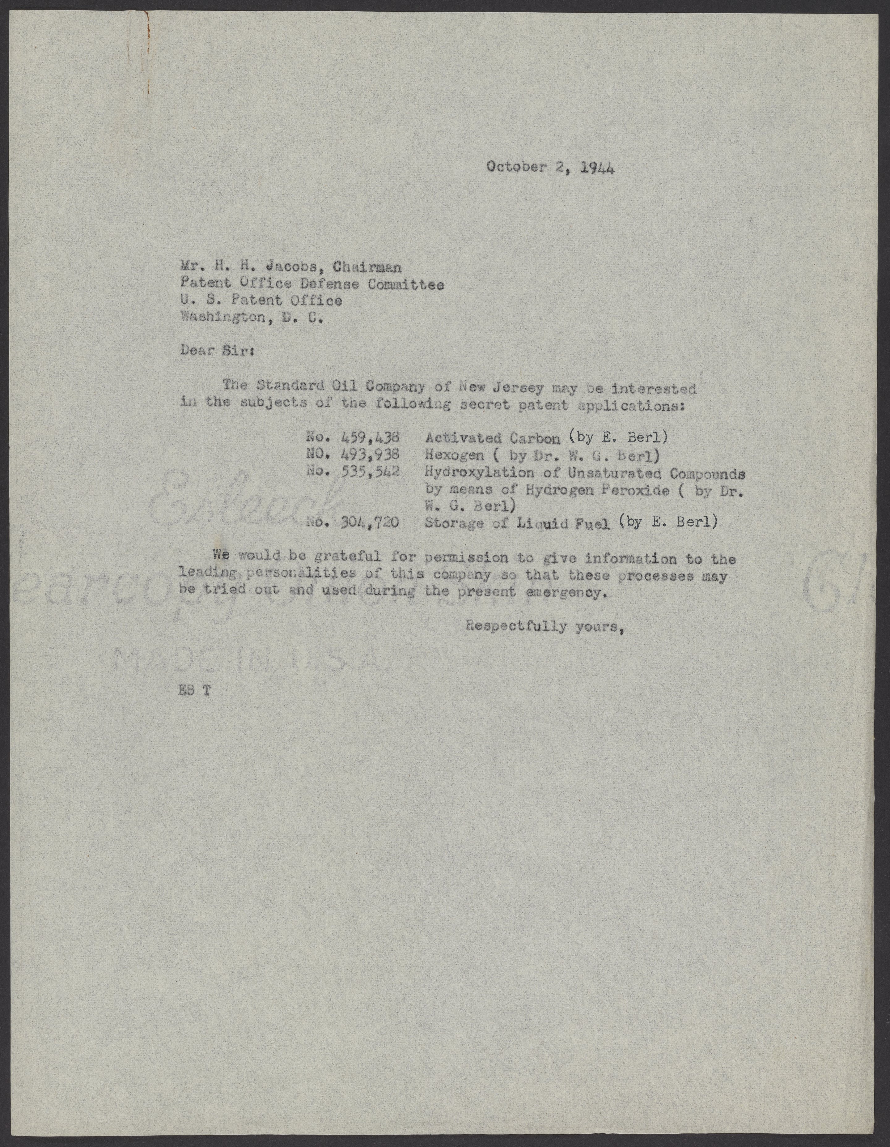 Letter from Ernst Berl (1877-1946) to H. H. Jacobs, the chairman of the Patent Office Defense Committee. Berl asks if the Standard Oil Company of New Jersey would want information on secret patent applications (by Berl and a "W. G. Berl") in the case of an emergency.