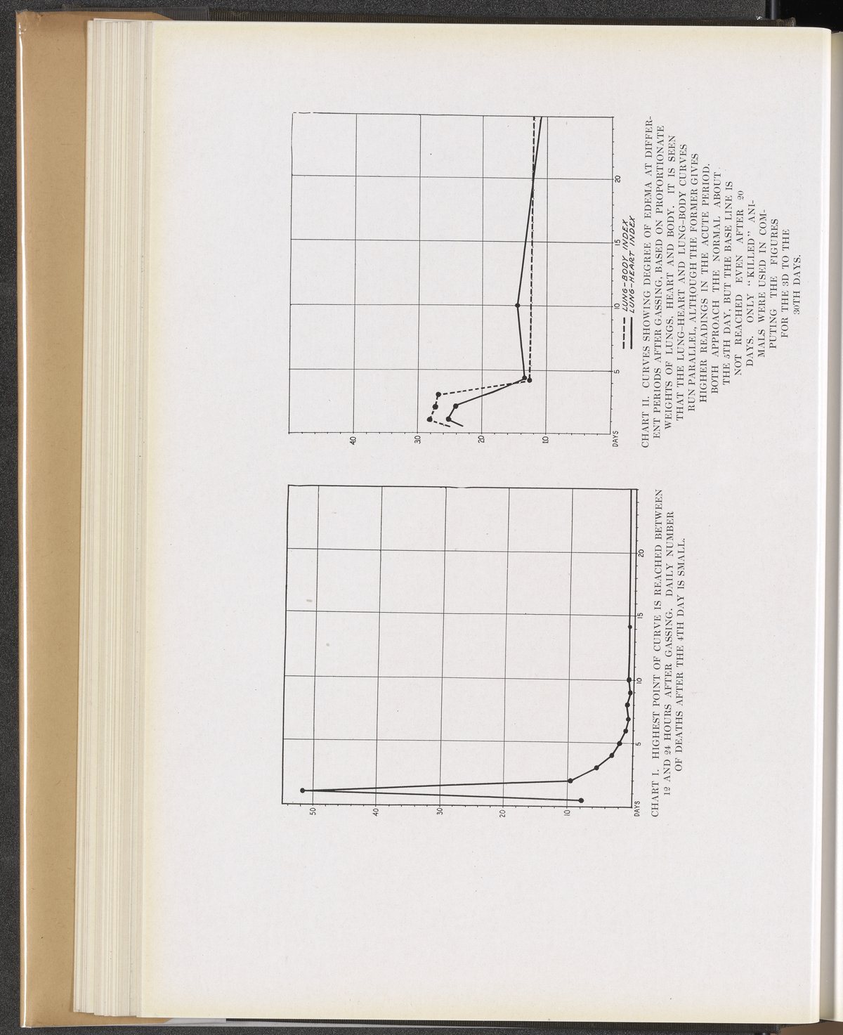 Chart 1: Highest point of curve is reached between 12 and 24 hours after gassing. Chart 2: Curves showing degree of edema at different periods after gassing, based on proportionate weights of lungs, heart, and body.