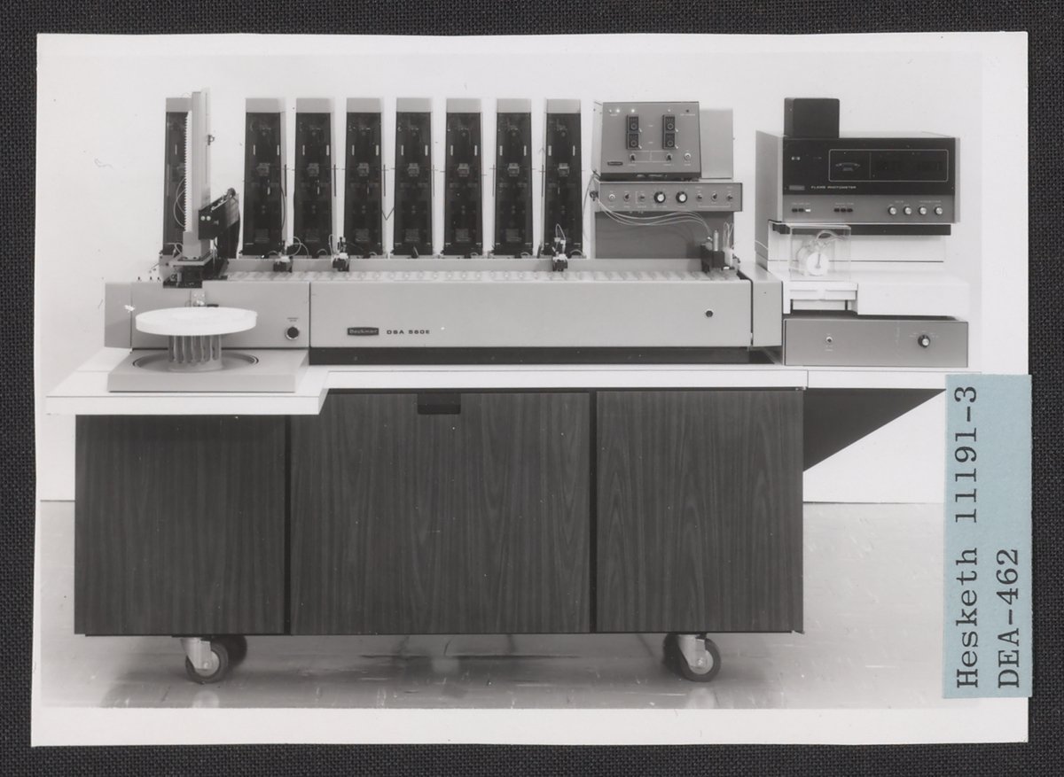 Hesketh, Dean D. “Beckman DSA 560E Discrete Sample Analyzer,” circa 1968. Beckman Historical Collection, Box 86. Science History Institute. Philadelphia. https://digital.sciencehistory.org/works/jw827c059.