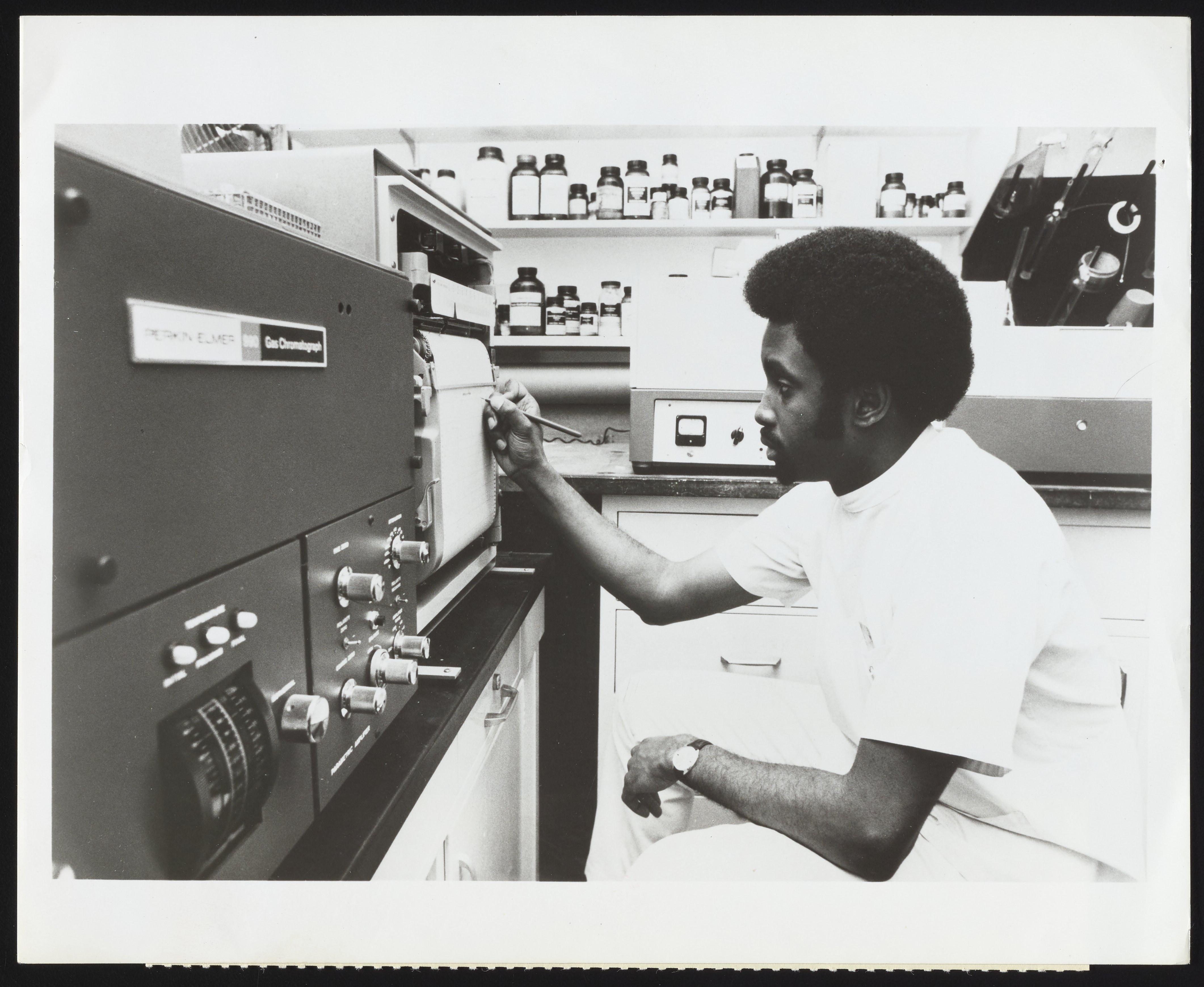 General view of medical technician Michael D. Shaw using a Perkin-Elmer Model 930 Gas Chromatograph to analyze a urine sample in the toxicology laboratory at St. Francis Hospital in Hartford, Connecticut. Per notations accompanying the photograph, Shaw is seen pinpointing a peak on the gas chromatograph's recording graph in order to determine which drug an apparent overdose victim had taken and develop a corresponding course of treatment.