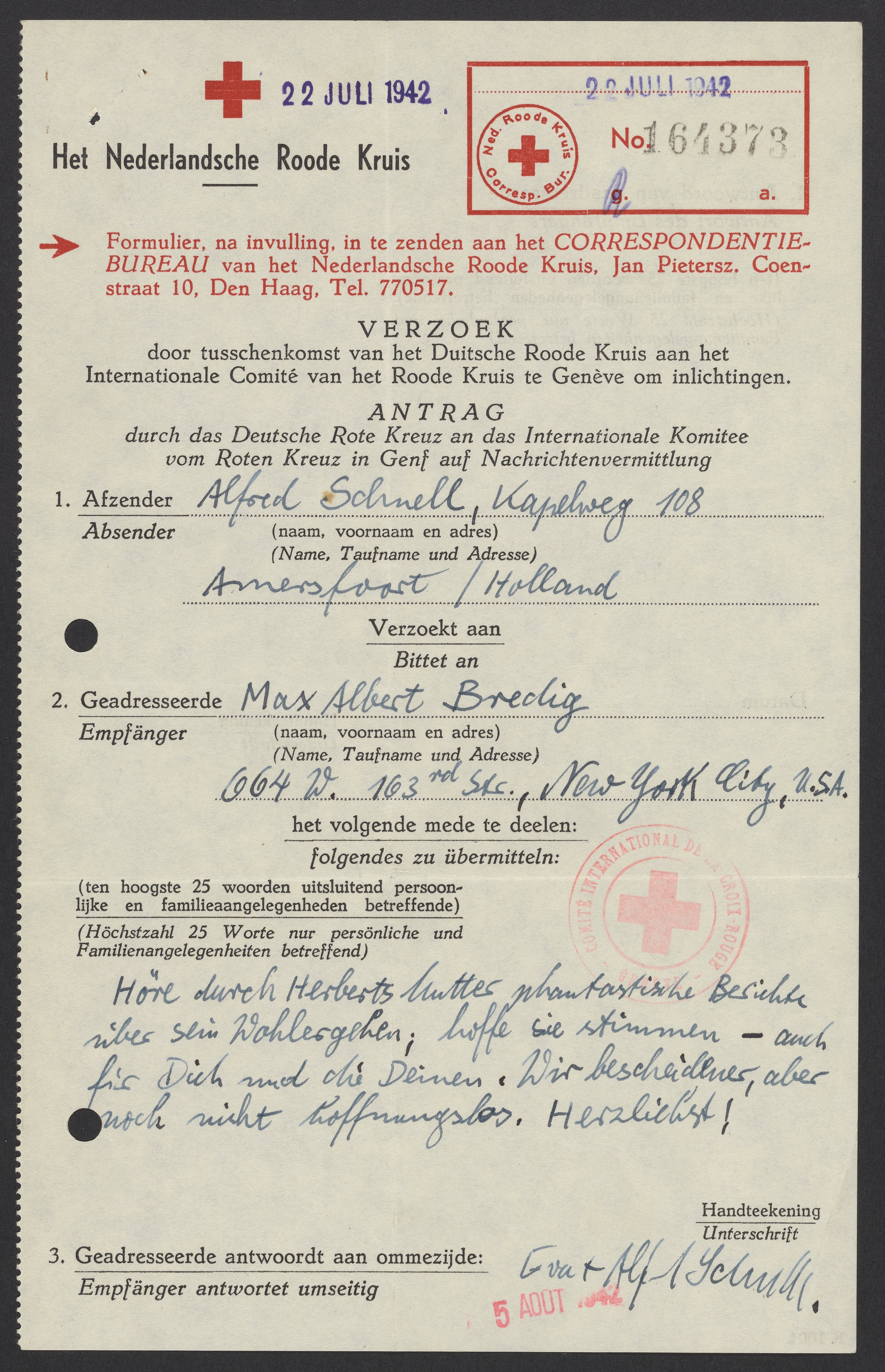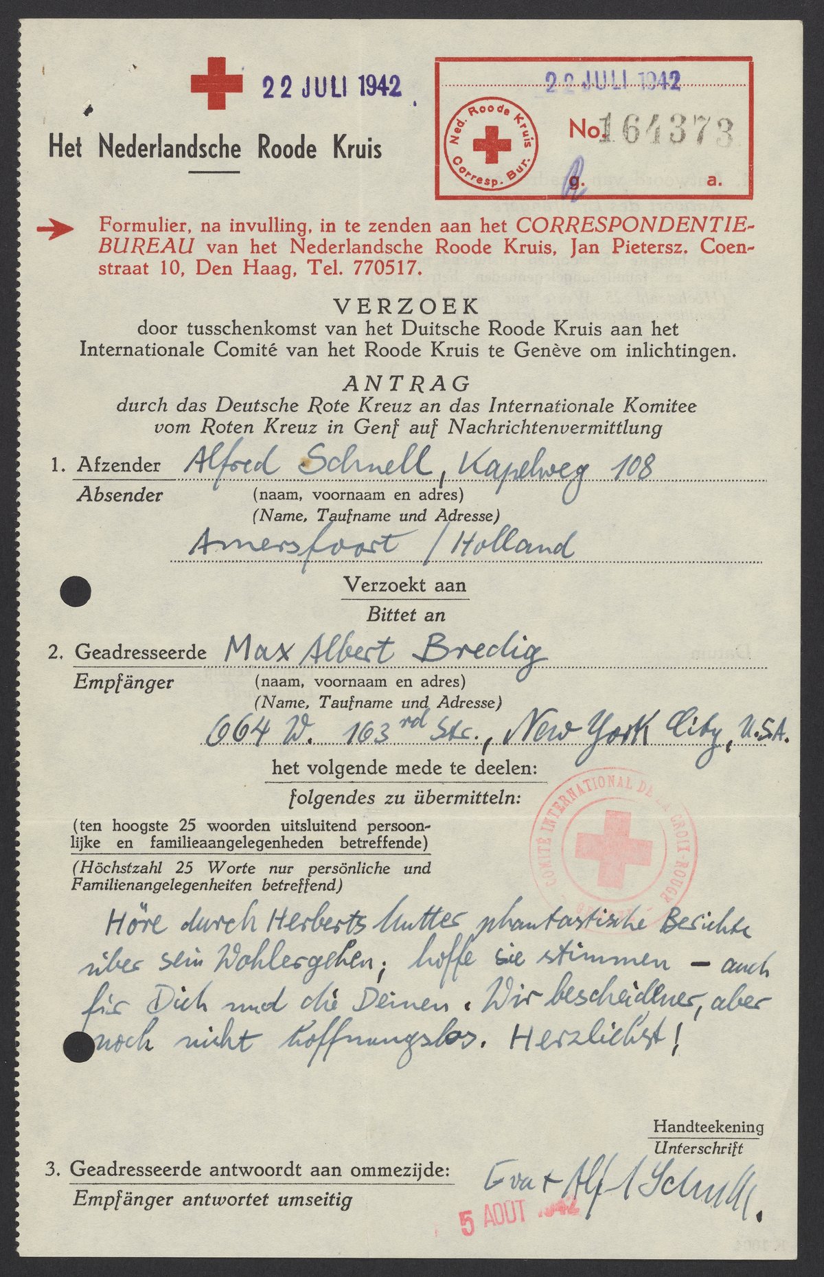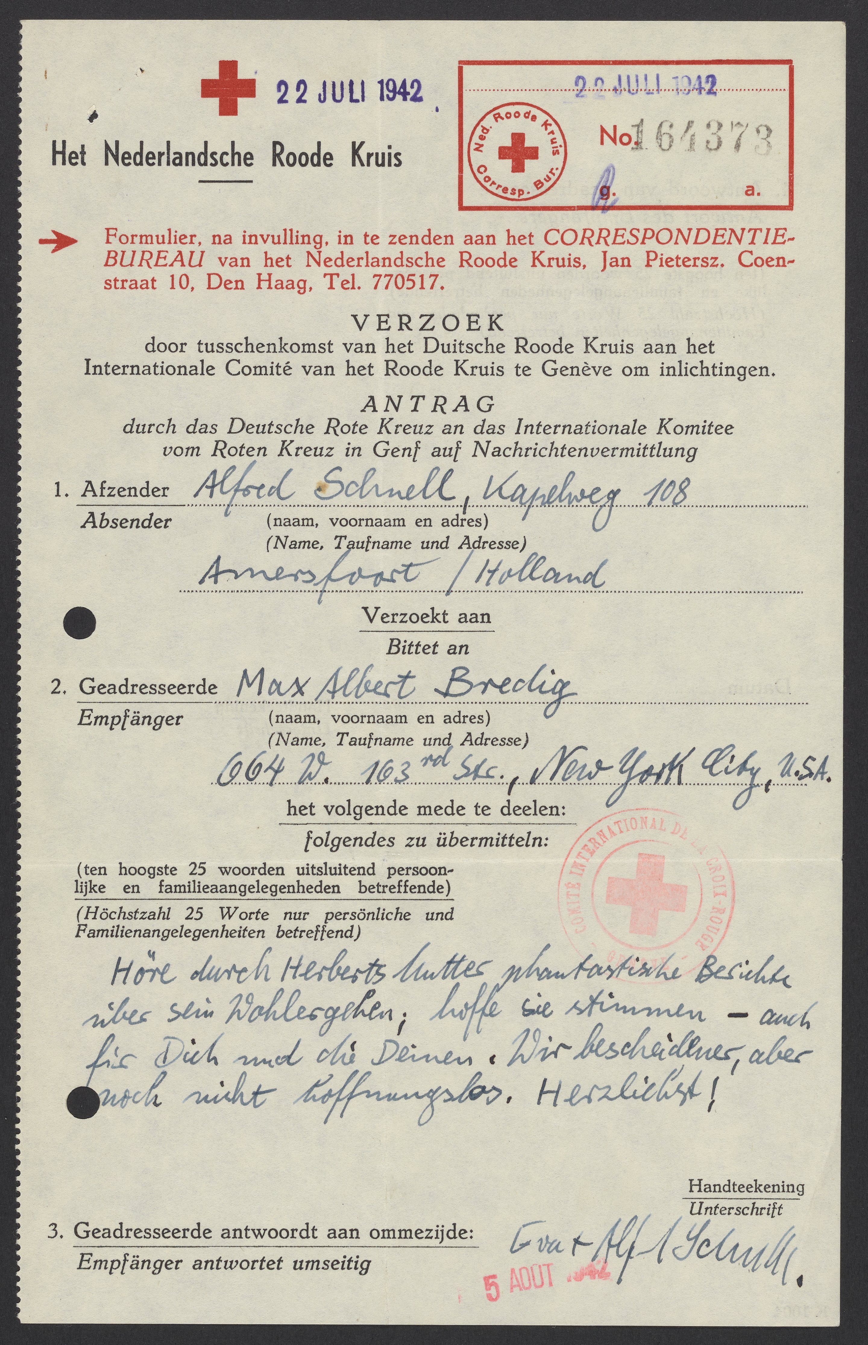 In this letter, the Schnells tell Bredig that they have heard news of someone named Herbert. While the message is dated July 22, 1942, it was not received until August 5, 1942.