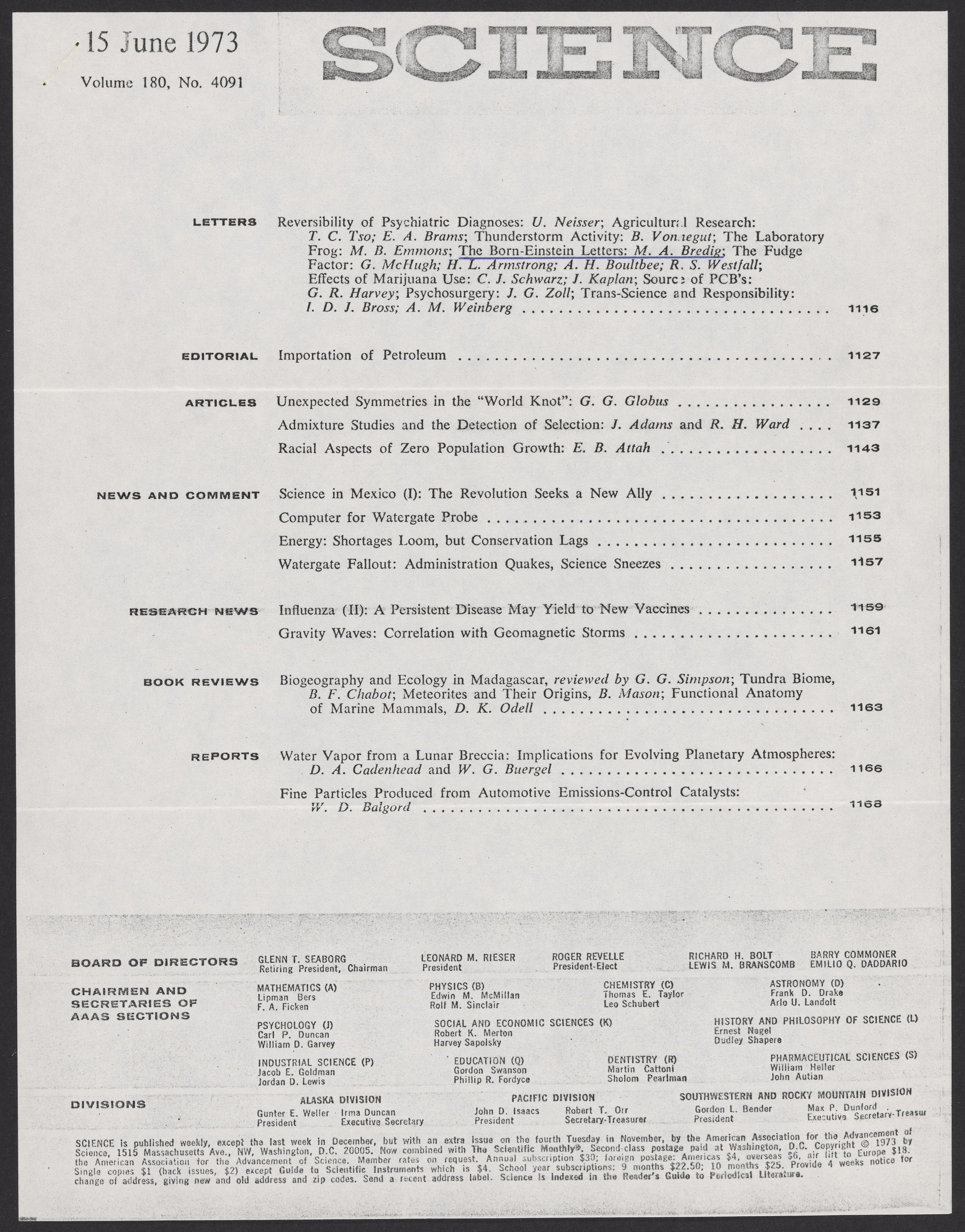 “Science, Volume 180, Number 4091.” American Association for the Advancement of Science, June 15, 1973. Papers of Max Bredig, Box 1, Folder 18. Science History Institute. Philadelphia. https://digital.sciencehistory.org/works/jwsq0so.