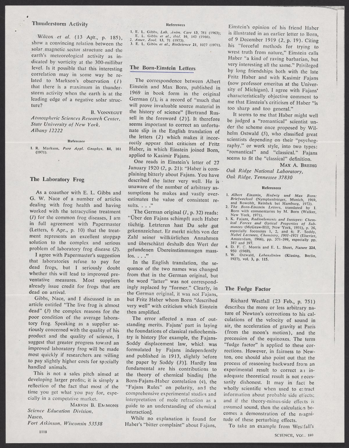 Small JPG1200 x 1532px — 339 KBLarge JPG2880 x 3676px — 1.9 MBFull-sized JPG5359 x 6841px — 6.0 MBOriginal fileTIFF — 5359 x 6841px — 105 MBPhotocopy of Science, Volume 180, Number 4091, published by the American Association for the Advancement of Science. This clipping includes a correction of a mistranslation of a letter between Albert Einstein (1879-1955) and Max Born (1882-1970). Einstein was criticizing scientist Fritz Haber (1868-1934), due to a translation error, the criticism was attributed to Kasimir Fajans (1887-1975).