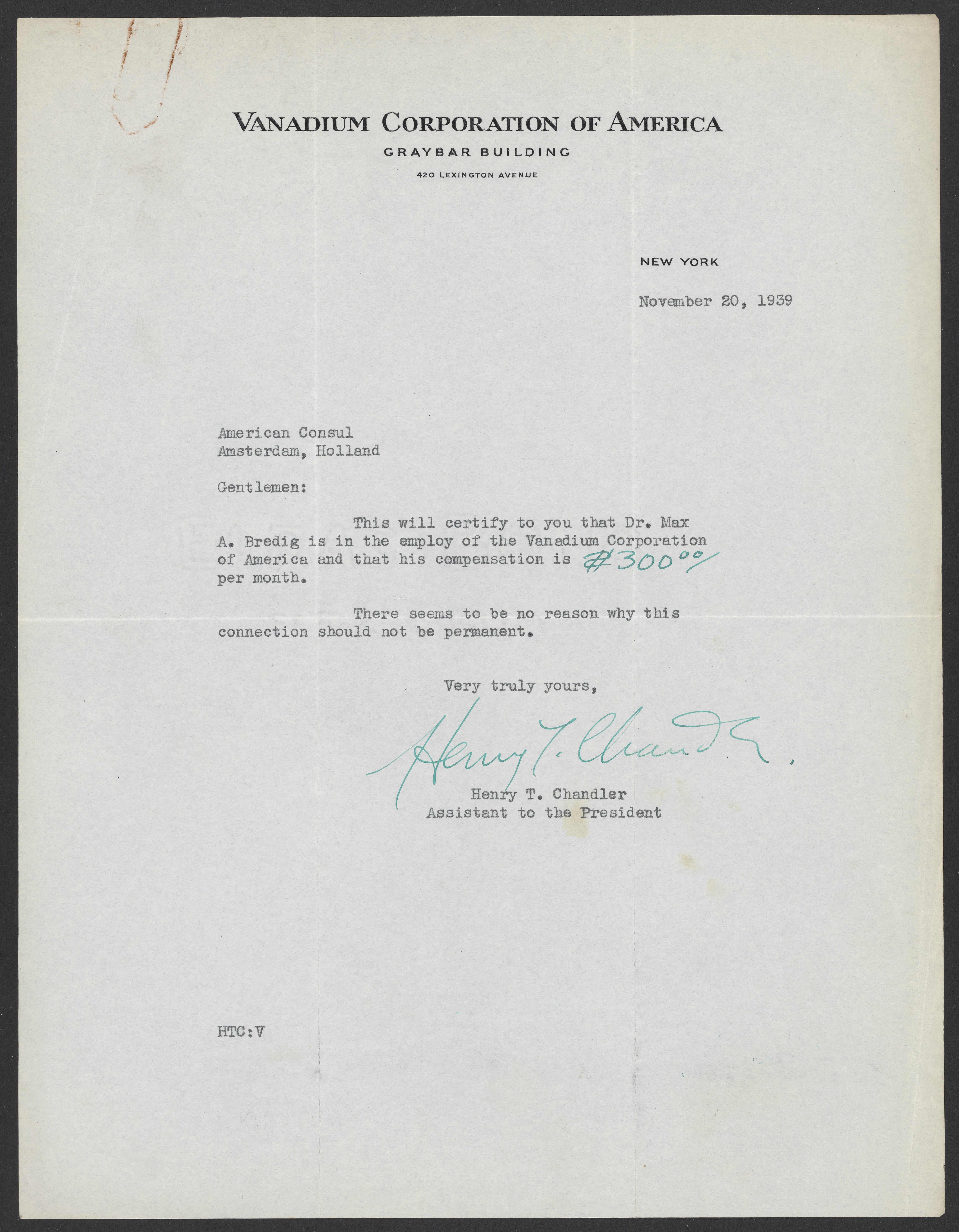 Letter from Henry T. Chandler to the American Consul of Amsterdam, Holland