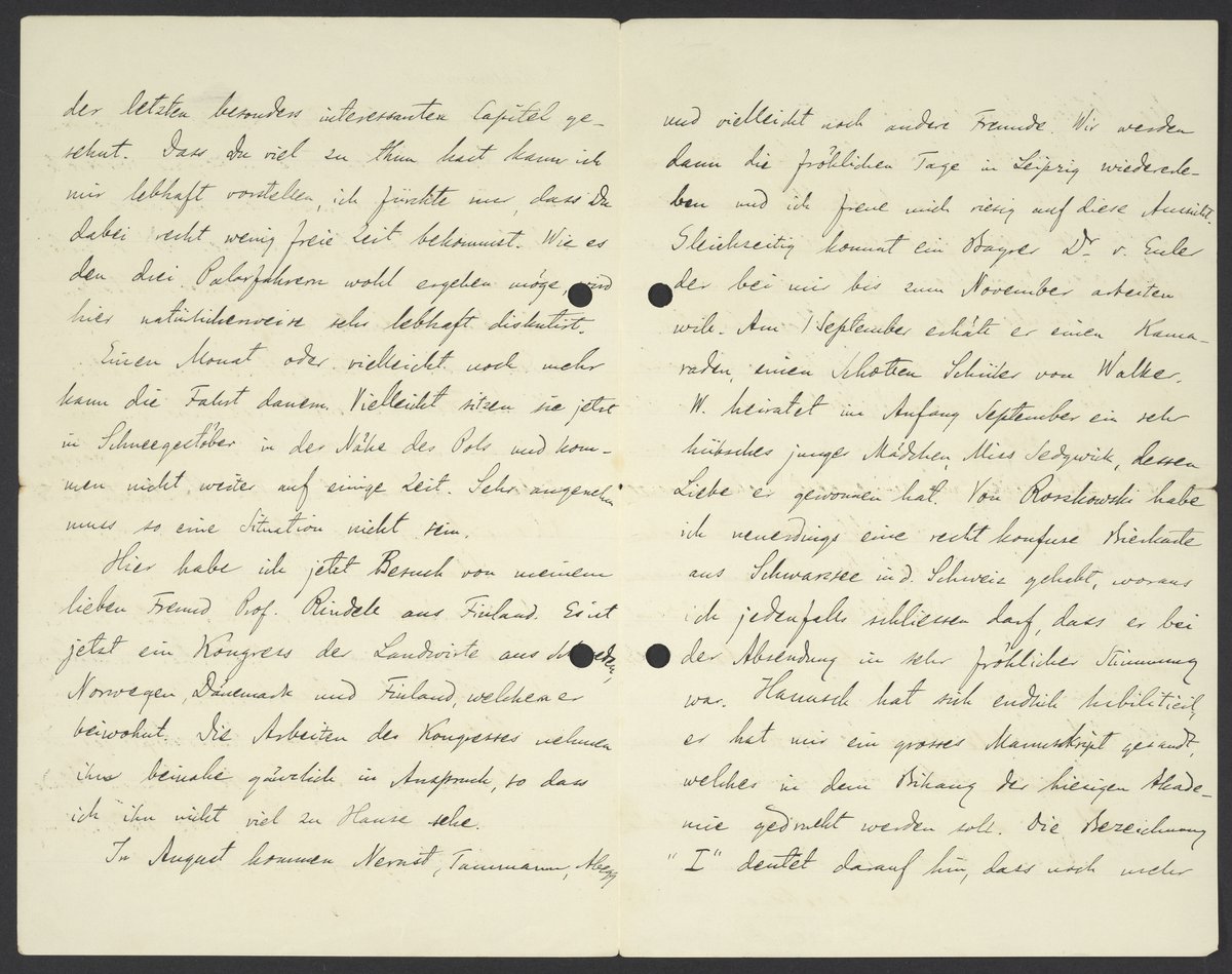 In August, Nernst, Tammann, Abegg and other friends will come for a visit. Perhaps we will relive our happy days in Leipzig and I really look forward to this prospect! At the same time, Dr. von Euele, a Bavarian, will arrive to work with us until November. On September 1, he will receive a new colleague, a Scottish student of Walker’s. In early September, W. plans to marry a very pretty young girl, Miss Sedgwick, whose heart he has won. Rosskowski recently sent me a rather confusing postcard from Schwansee in Switzerland, from which I can at least infer that he was in good spirits when he left. Harrusch finally qualified as a professor. He sent me a large manuscript, which will be printed in the appendix of the local academy. The designation "I" indicates that more will follow.
