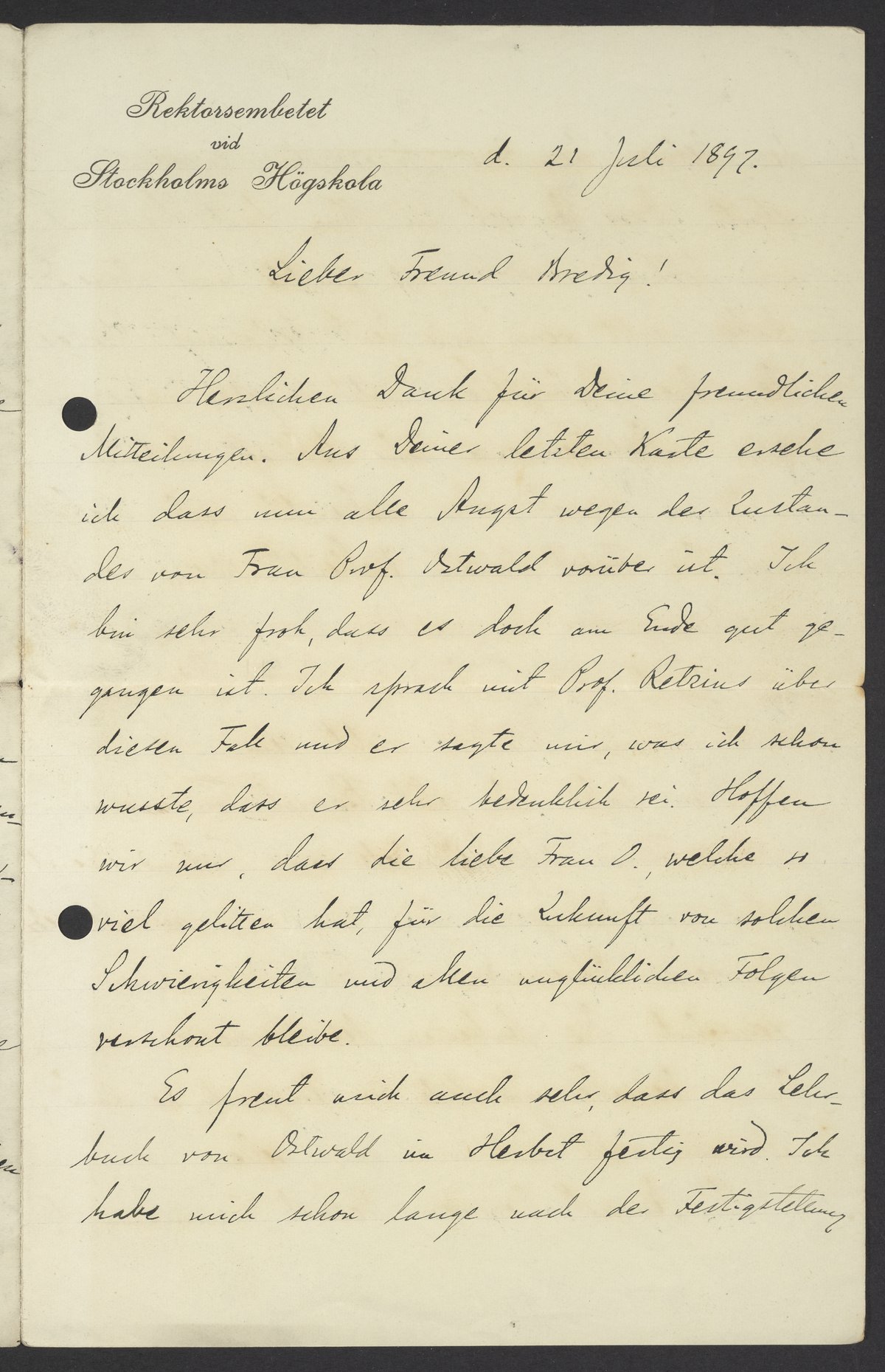Herzlichen Dank für Deine freundlichen Mitteilungen. Aus Deiner letzten Karte ersehe ich dass nun alle Angst wegen des Zustandes von Frau Professor Ostwald vorbei ist. Ich bin sehr froh, dass es doch am Ende gut gegangen ist. Ich sprach mit Prof. Retrius über diesen Fall und er sagte mir, was ich schon wusste, dass er sehr bedenklich sei. Hoffen wir nur, dass die liebe Frau O., welche so viel gelitten hat, für die Zukunft von solchen Schwierigkeiten und allen unglücklichen Folgen verschont bleibe.