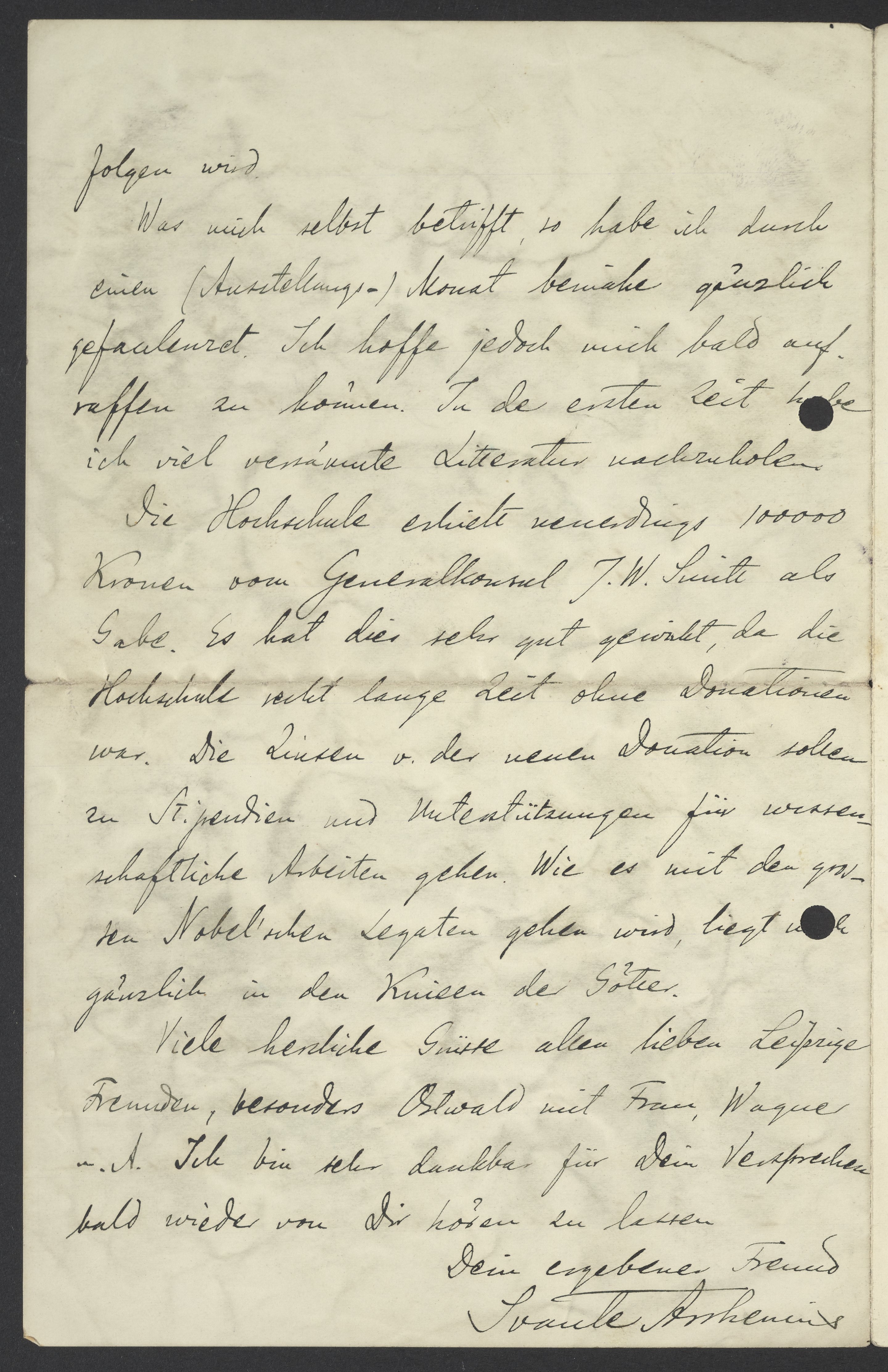 Small JPG1200 x 1859px — 306 KBLarge JPG2880 x 4461px — 1.4 MBFull-sized JPG3389 x 5250px — 1.8 MBOriginal fileTIFF — 3389 x 5250px — 51.0 MBLetter from Svante Arrhenius (1859-1927) to Georg Bredig (1868-1944) discussing personal and professional news. Names fellow chemists within Bredig and Arrhenius' circle such as Richard Abegg (1869-1910), Walther Nernst (1864-1941), and Friedrich Wilhelm Ostwald (1853-1932). Topics of note include the impending competition of Ostwald's textbook, titled Lehrbuch der Allgemeinen Chemie, and a large donation of 100,000 crowns from Consul General Johan Wilhelm Smitt (1821-1904) to Stockholm University.
