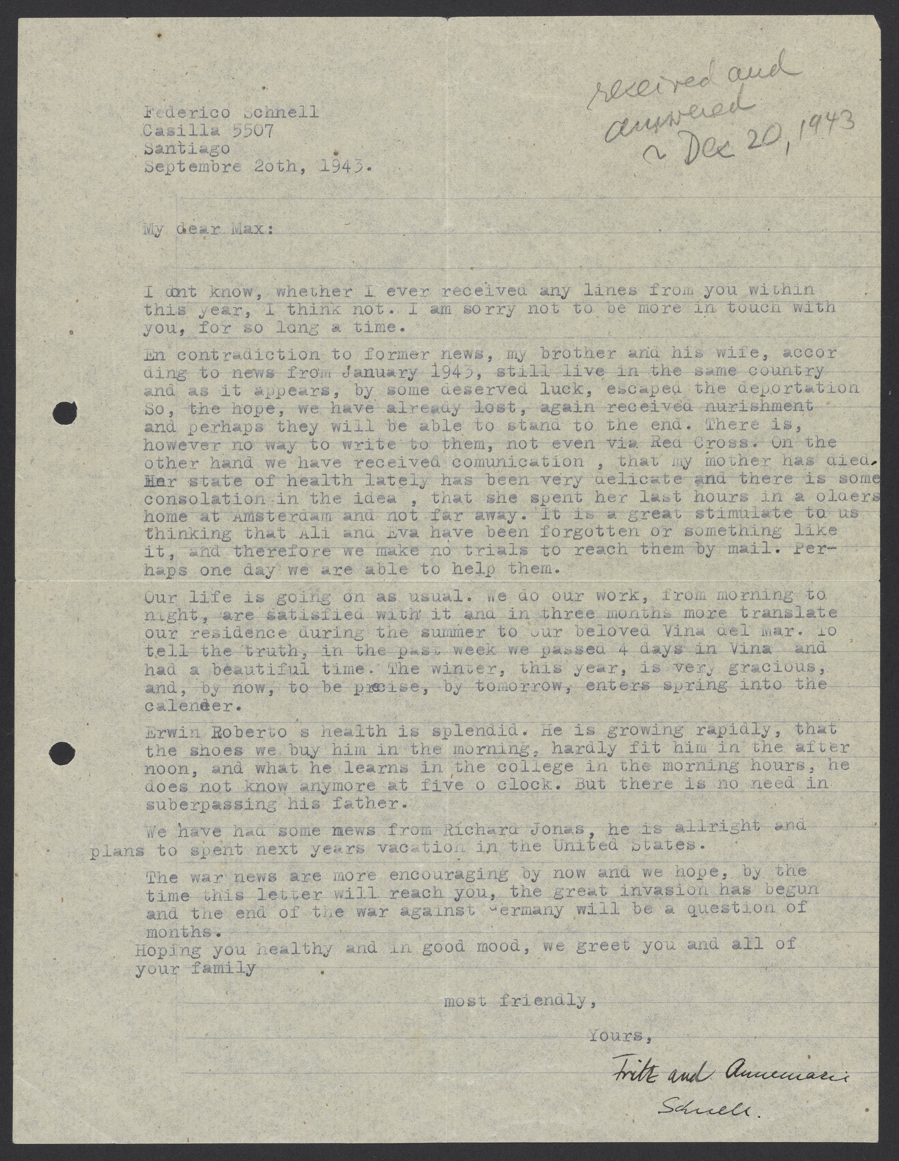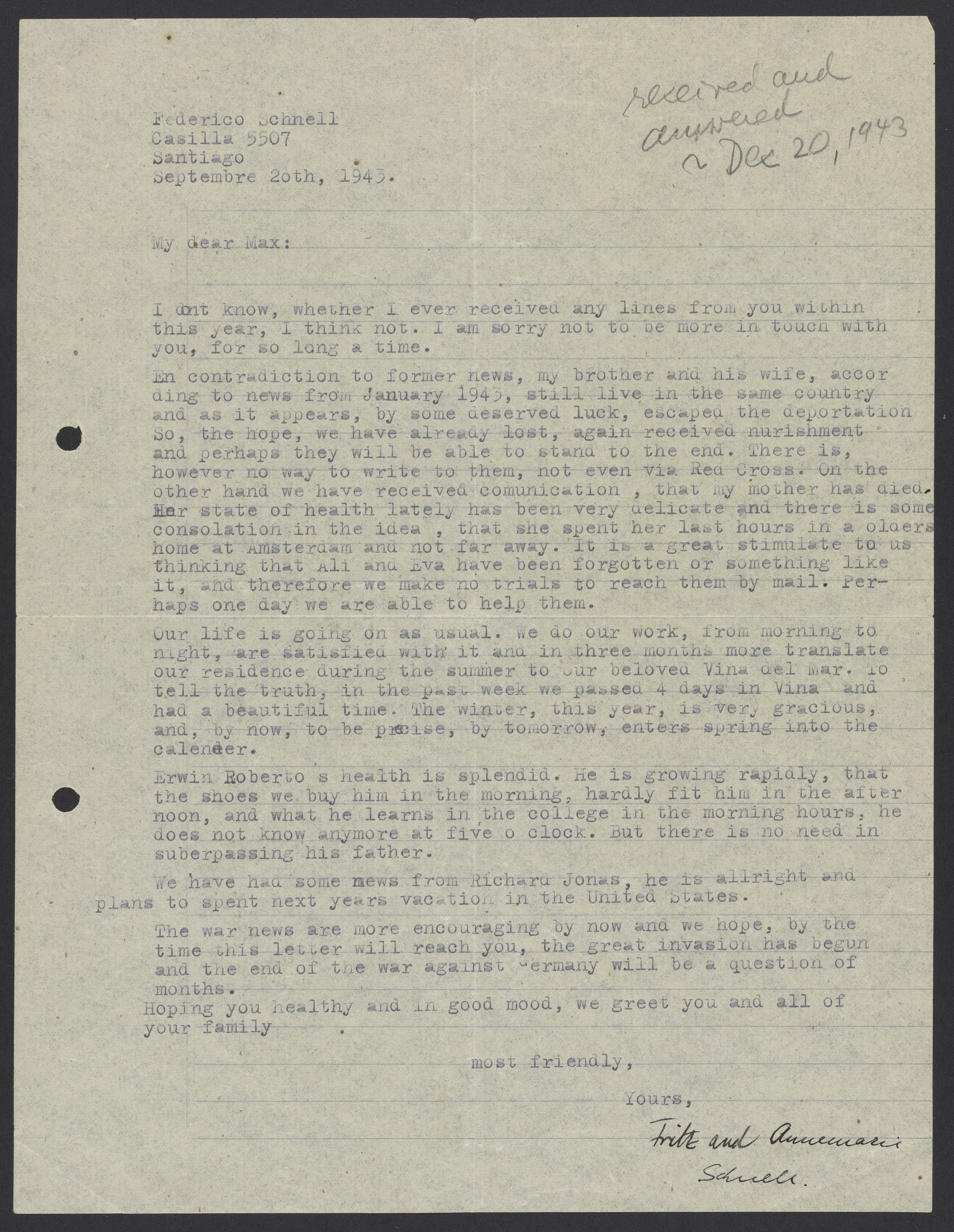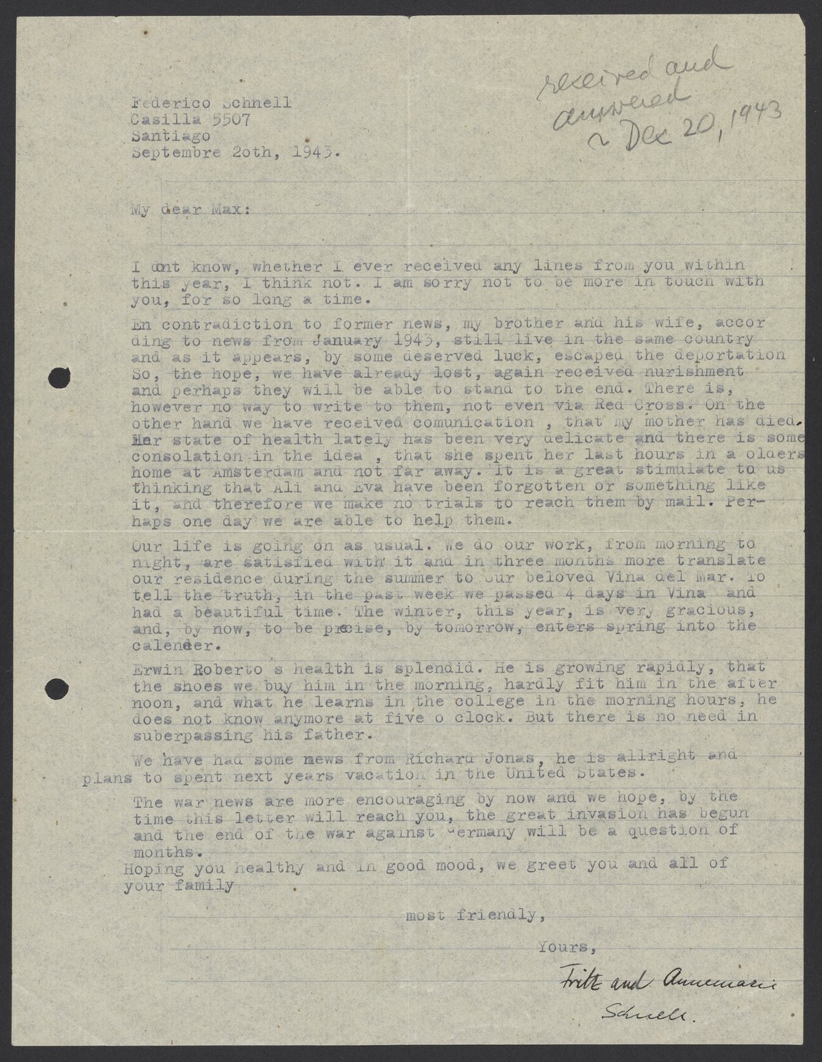 Letter from Federico Schnell to Max Bredig, September 20, 1943