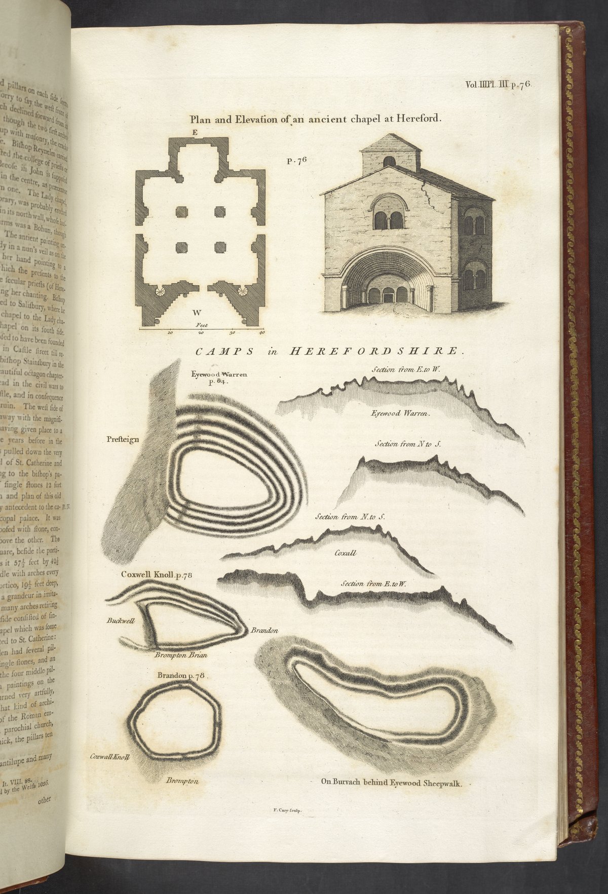 Engraving by Francis Cary (active 18th century) depicting the plan and elevation of an ancient chapel located in Hereford, England. The engraving is derived from a collection of drawings by English antiquarian, physician, and clergyman William Stukeley (1687-1765). Notably, the Society of Antiquaries of London commissioned Stukeley's drawing in 1737 following the announcement of the impending demolition of the chapel. The engraving also includes plans of several Roman camps located throughout the county of Herefordshire.