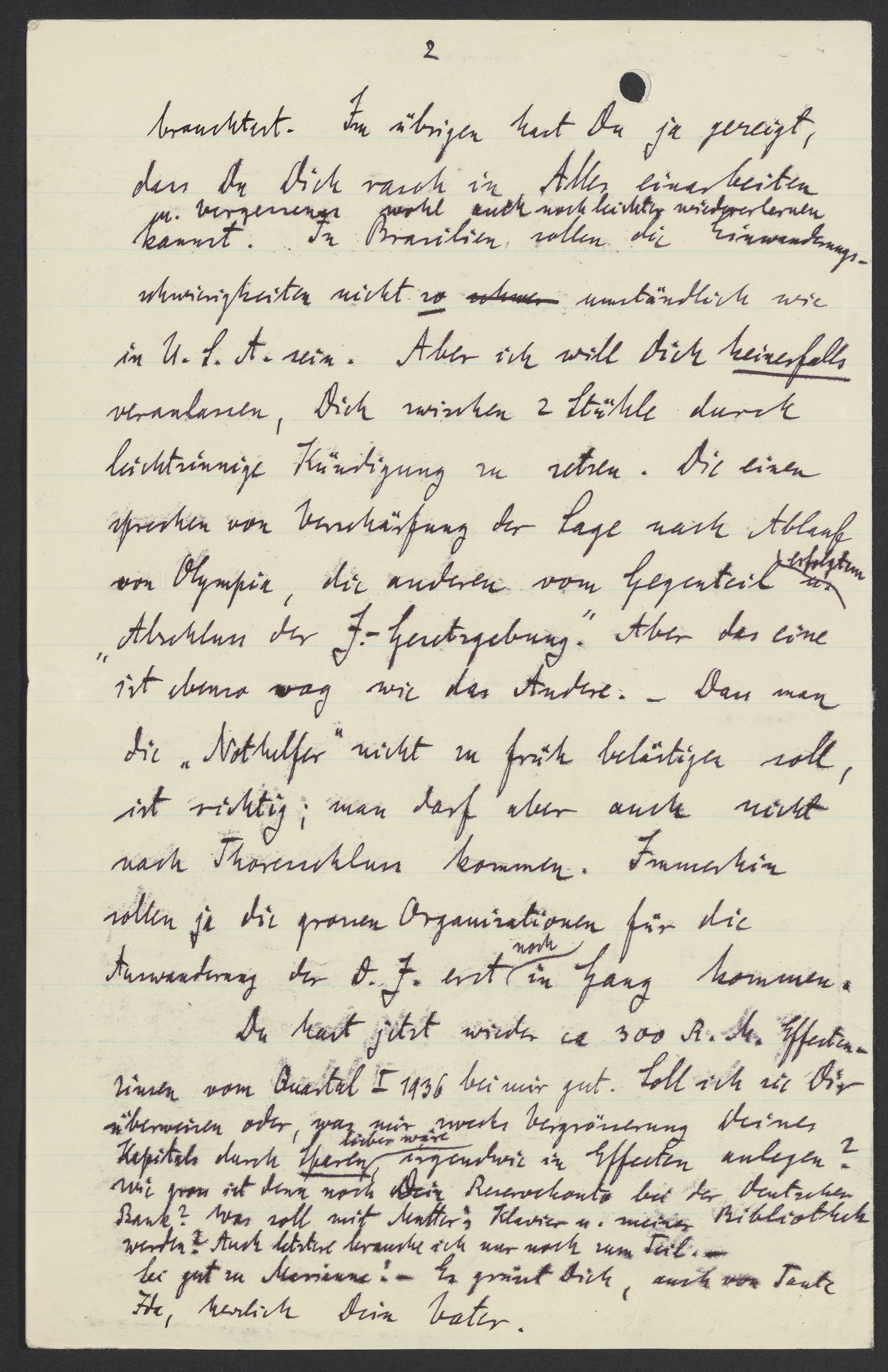 brauchtest. Im übrigen hast Du ja gezeigt, dass Du Dich rasch in Alles einarbeiten u. vergessener wohl auch noch leicht wiedererlernen kannst. In Brasilien sollen die Einwanderungsschwierigkeiten nicht so umständlich wie in U.S.A. sein. Aber ich will Dich keinesfalls veranlassen, Dich zwischen 2 Stühle durch leichtsinnige Kündigung zu setzen. Die einen sprechen von Verschärfung der Lage nach Ablauf von Olympia, die anderen vom Gegenteil u. erfolgtem „Abschluss der J.-Gesetzgebung.“ Aber das eine ist ebenso vag wie das Andere. Dass man die „Nothelfer“ nicht zu frueh belästigen soll ist richtig; man darf aber auch nicht nach Thorenschluss kommen. Immerhin sollen ja die grossen Organisationen für die Auswanderung der D.J. erst noch in Gang kommen.