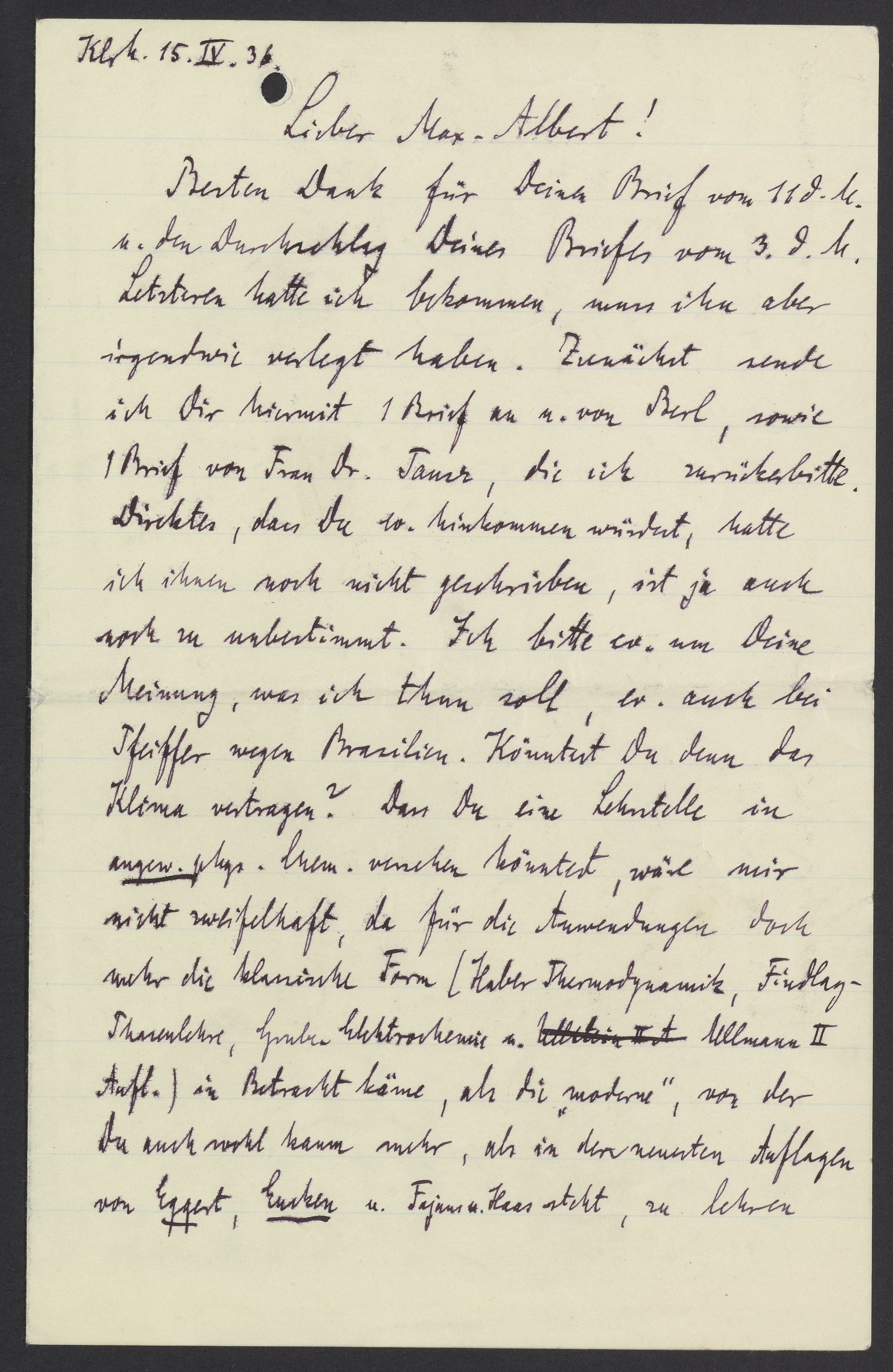 Bredig, Georg. “Letter from Georg Bredig to Max Bredig, April 15, 1936,” April 15, 1936. Papers of Georg and Max Bredig, Box 7, Folder 12. Science History Institute. Philadelphia. https://digital.sciencehistory.org/works/jzod2w3.