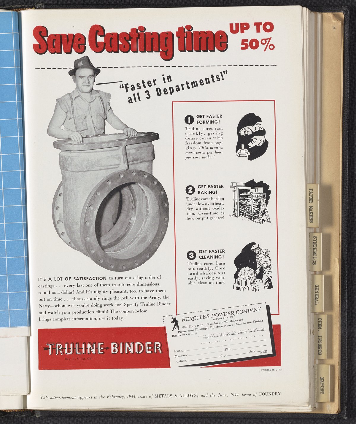Hercules Incorporated. “Truline Binder: Save Casting Time up to 50%.” 1944 Hercules Advertisements, 1944. Records of Hercules Incorporated, Volume 1944. Science History Institute. Philadelphia. https://digital.sciencehistory.org/works/k0698822h.