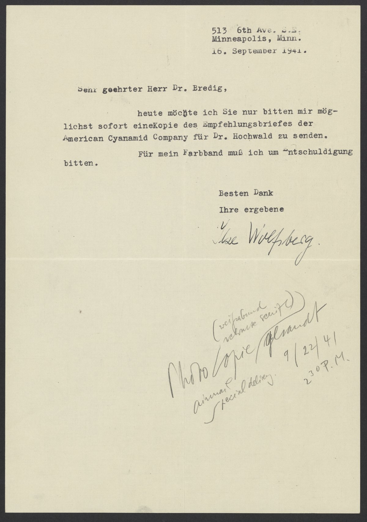 Letter from Ilse Wolfsberg to Max Bredig, September 16, 1941