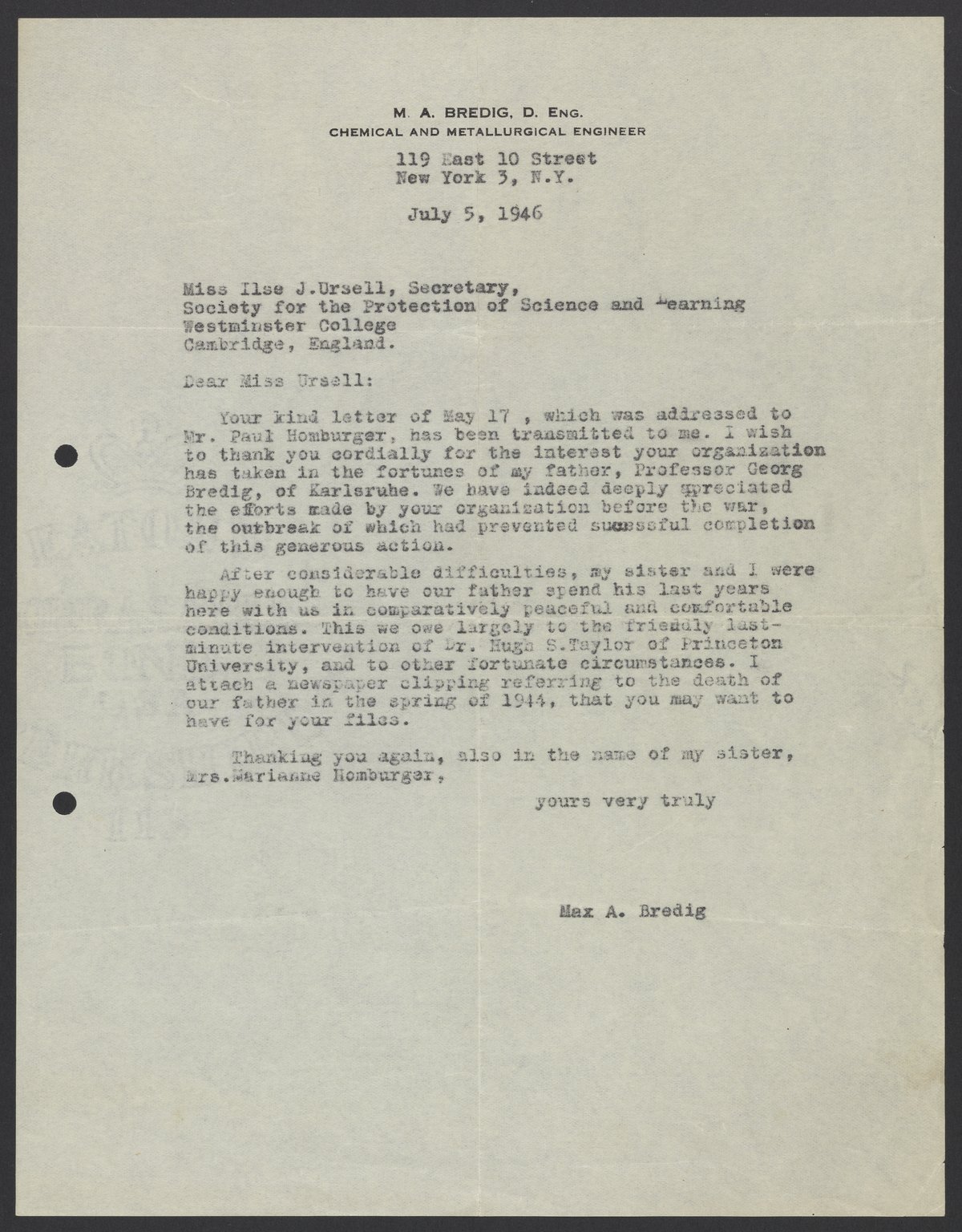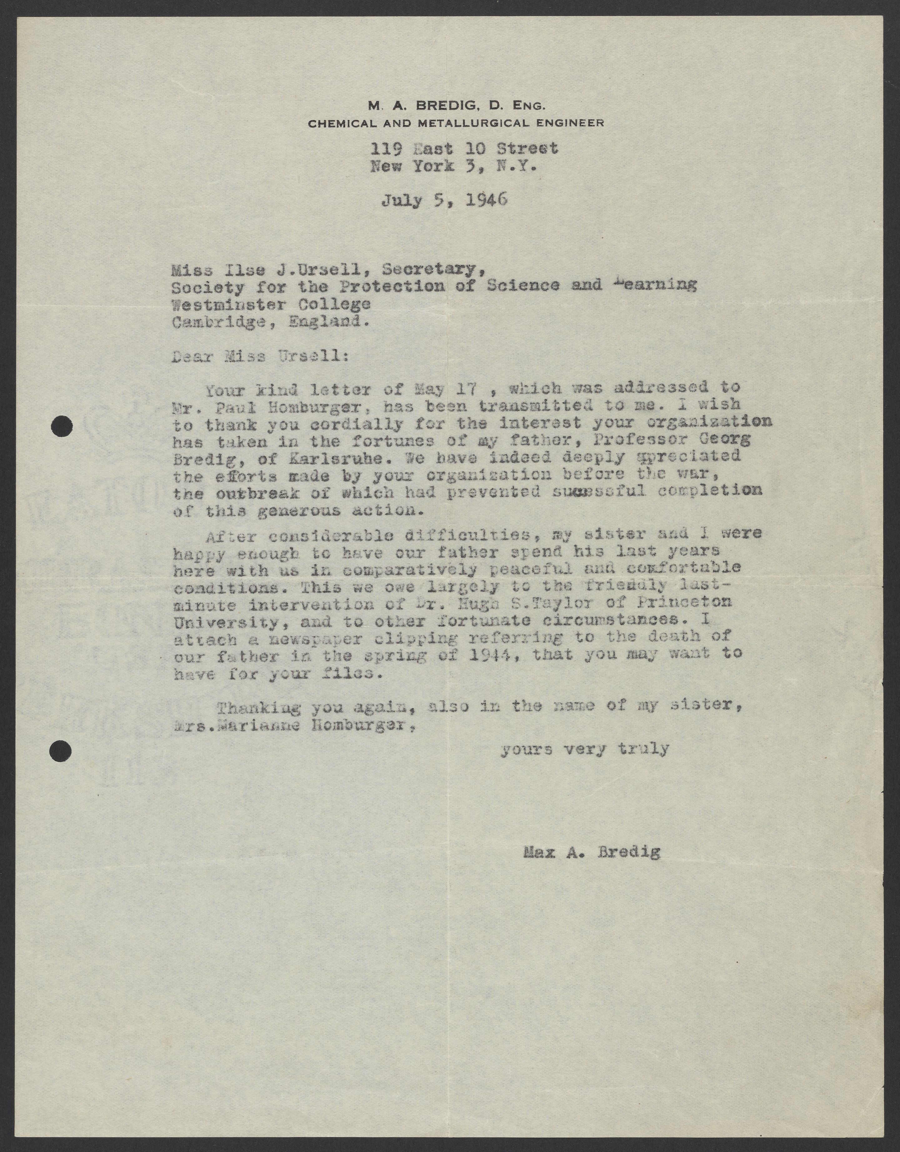 Max Bredig (1902-1977) responds to the secretary for the Society for the Protection of Science and Learning, Ilse J. Ursell. Bredig expresses his gratitude for the interest the Society has taken in his late father, Georg Bredig (1868-1944). Max recounts the efforts he and his sister, Marianne (1903-1987) took to arrange Georg's immigration from Germany, and credits Princeton University for their assistance in the process.