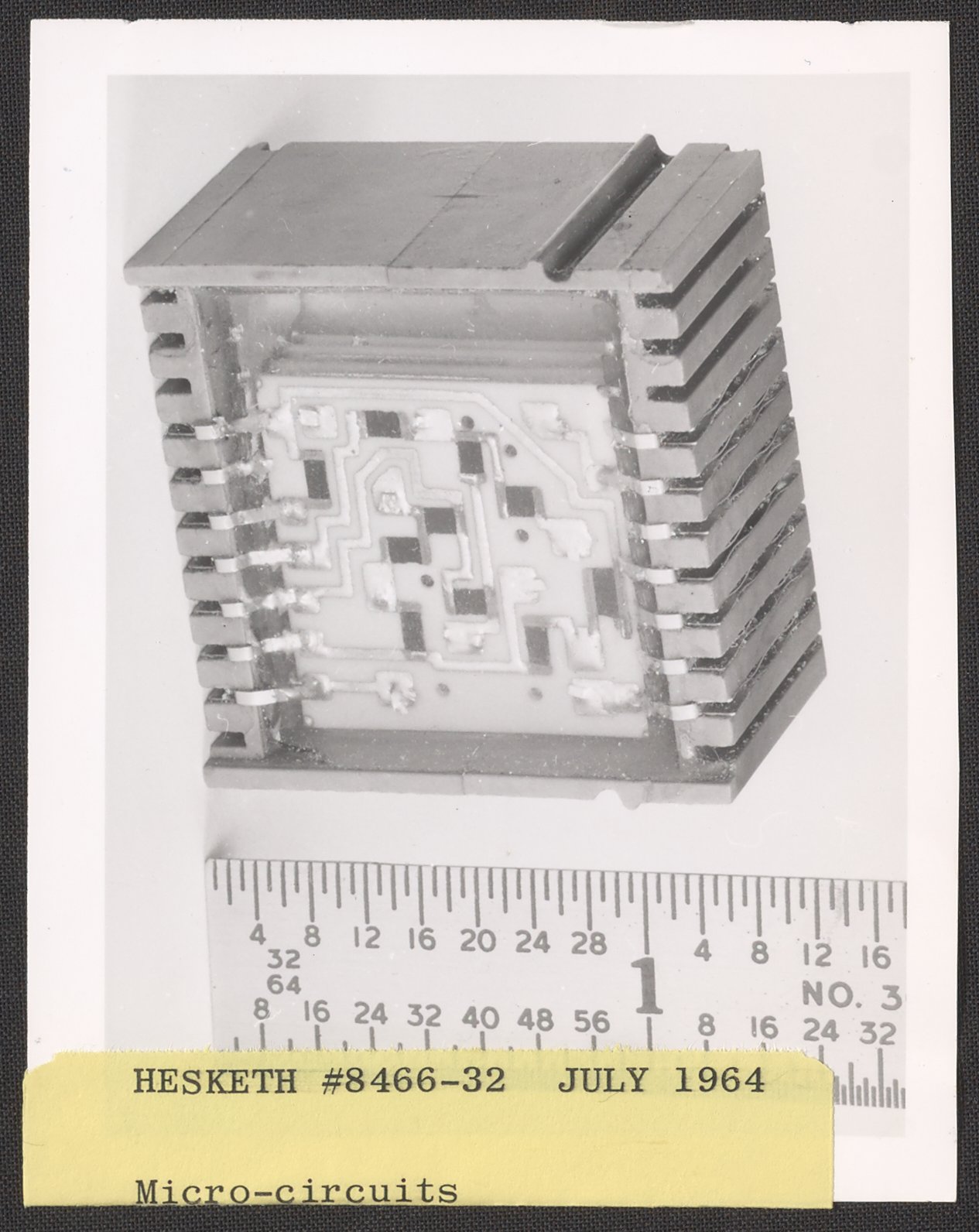 Hesketh, Dean D. “Helipot Custom Microcircuit with Ruler,” July 1964. Beckman Historical Collection, Box 85. Science History Institute. Philadelphia. https://digital.sciencehistory.org/works/k35694642.