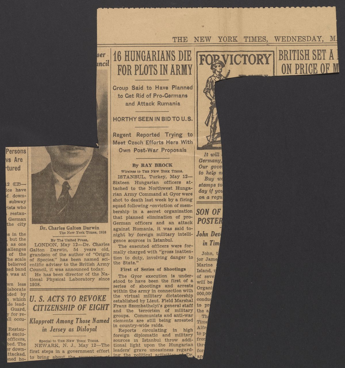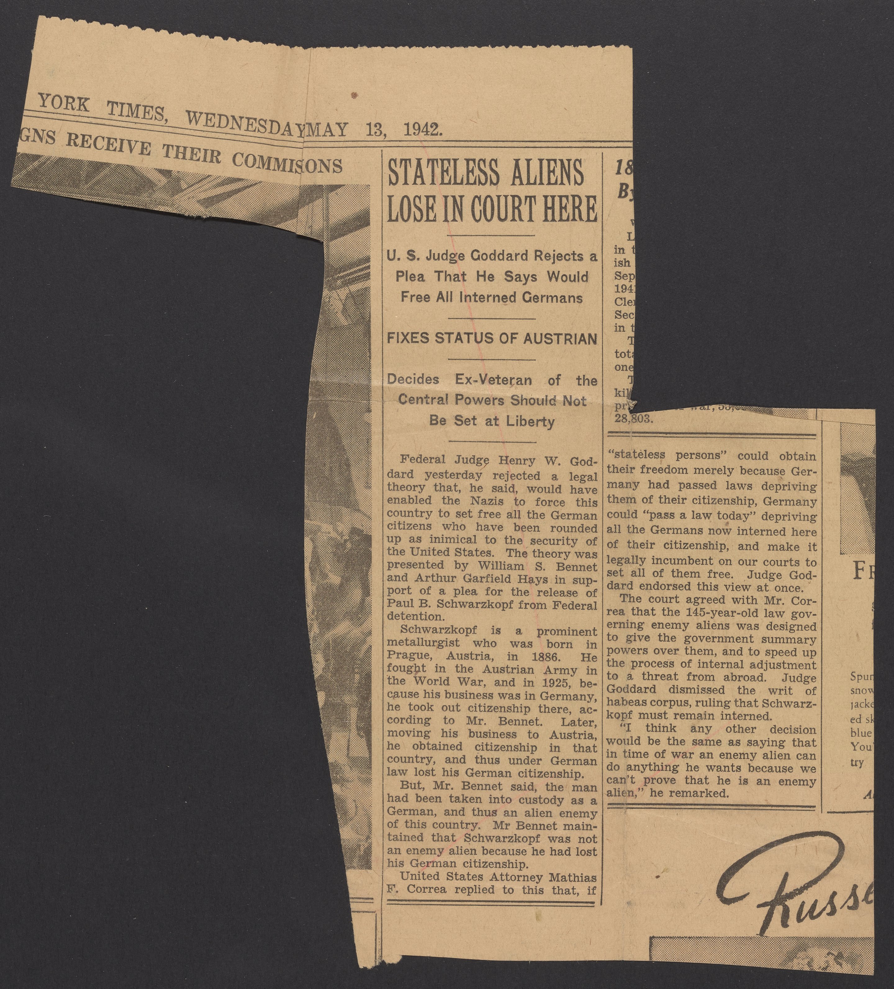 “Stateless Aliens Lose in Court Here.” New York, New York: New York times, May 13, 1942. Papers of Georg and Max Bredig, Box 10, Folder 26. Science History Institute. Philadelphia. https://digital.sciencehistory.org/works/k4bt48r.