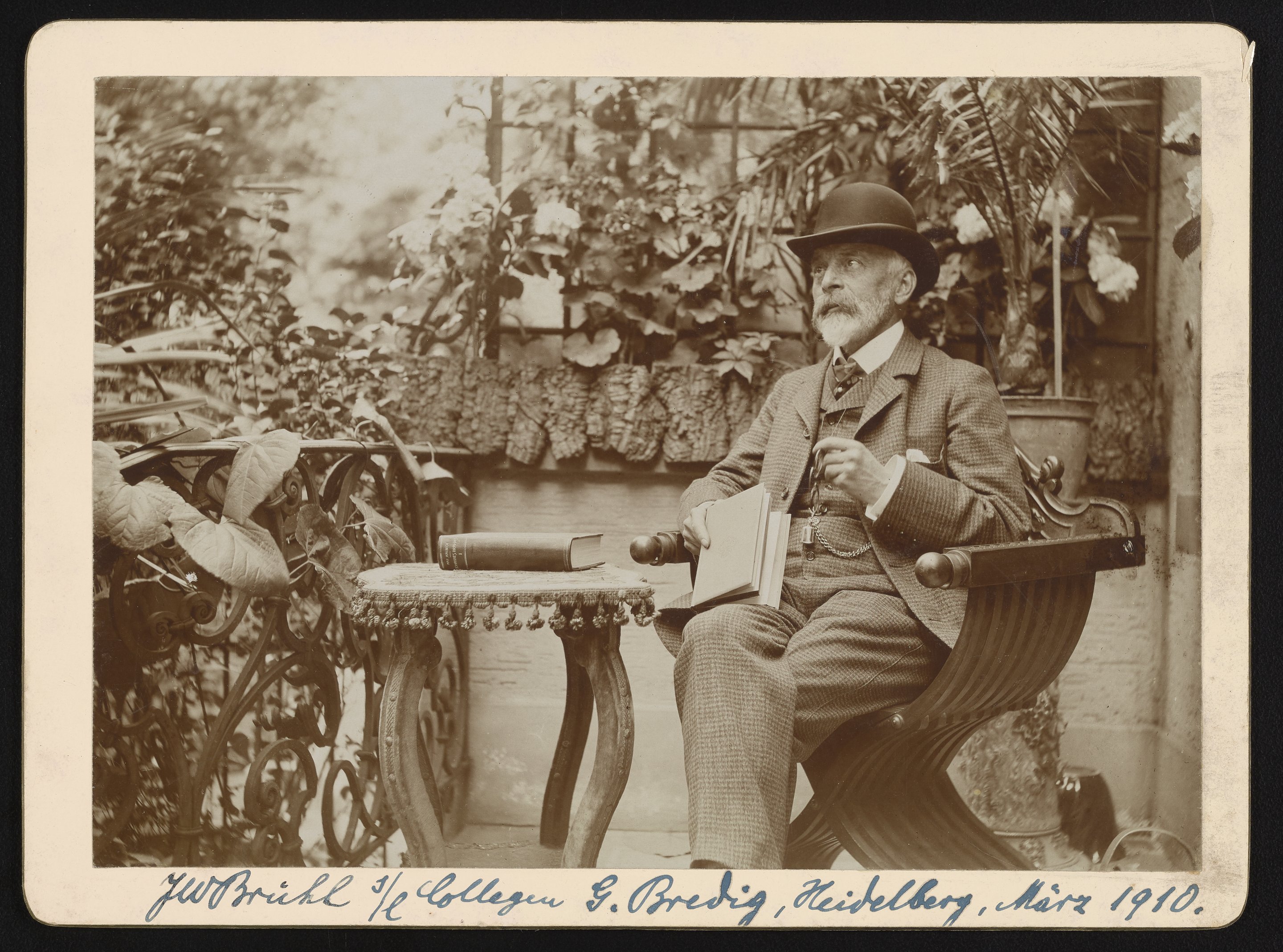 Black and white photograph of a man, likely Julius Wilhelm Brühl (1850-1911), sitting outside in a garden.