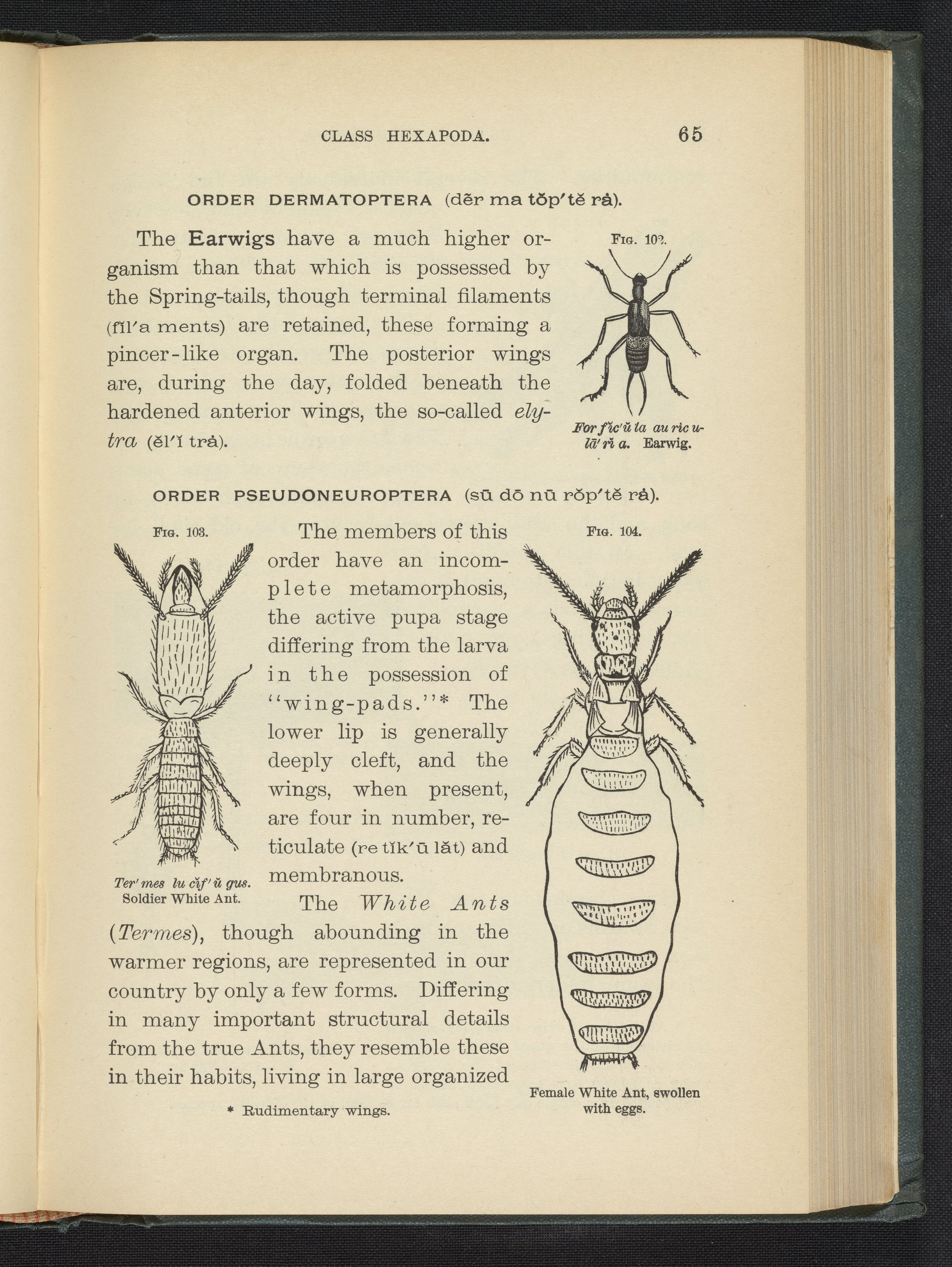 Steele, Joel Dorman, and Jenks, J. W. P. (John Whipple Potter). “Figure 102. Earwig. Figure 103. Soldier White Ant. Female White Ant .” Popular Zoology. New York, New York: Chautauqua Press, 1887. https://digital.sciencehistory.org/works/k53ziht.