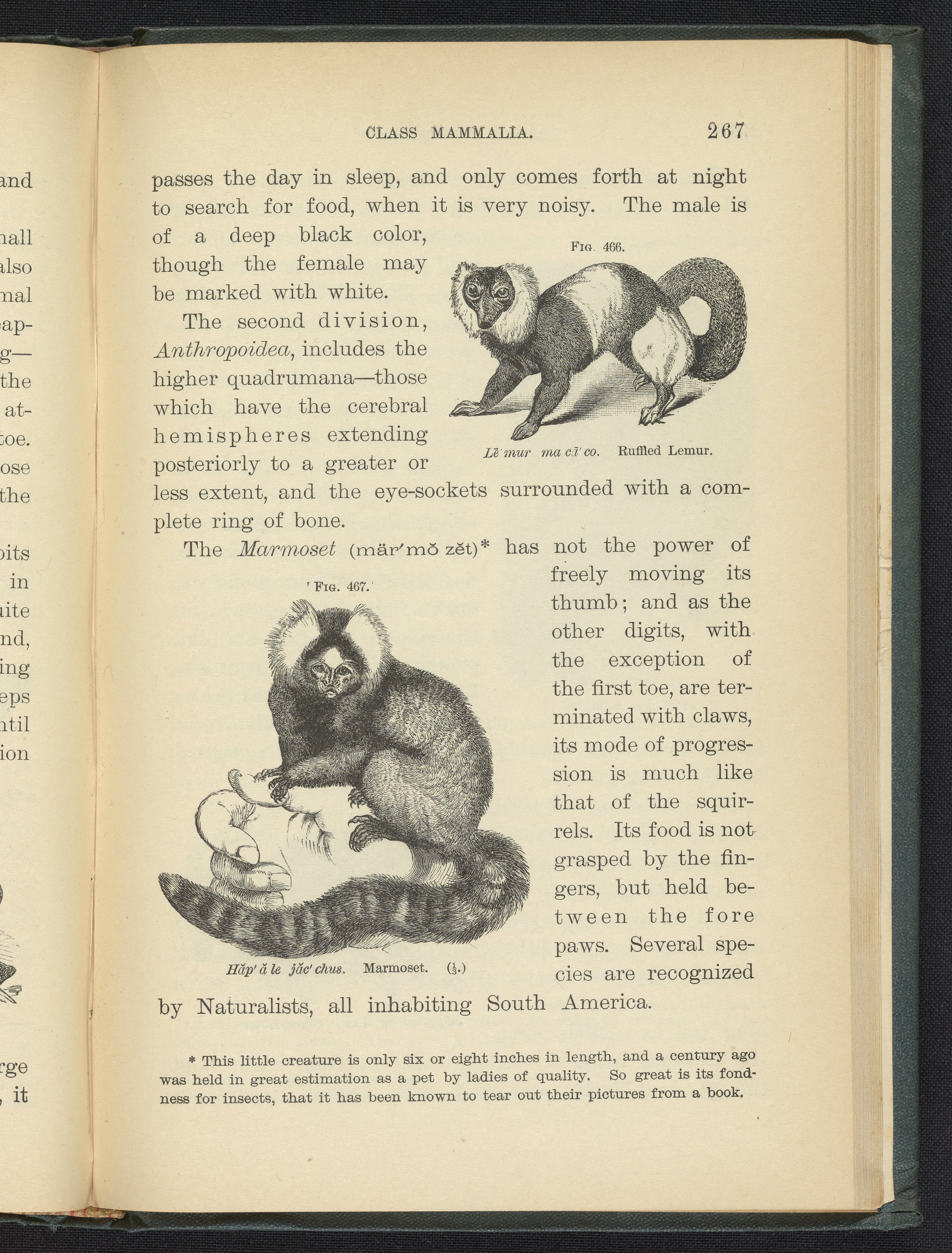 Figures 466 and 467 of the 1887 volume Popular Zoology. Figure 466 depicts a ruffled [ruffed] lemur. Figure 467 depicts a marmoset.