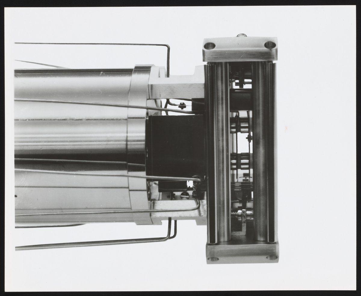 Small JPG1200 x 981px — 150 KBLarge JPG2880 x 2353px — 724 KBFull-sized JPG4244 x 3468px — 1.4 MBOriginal fileTIFF — 4244 x 3468px — 42.1 MBAssorted views of the ion source and oscilloscope designed for use with the Bendix Time-of-Flight Mass Spectrometer. One of four component parts of a mass spectrometer, the ion source produces a beam of particles characteristic of the sample material for qualitative and quantitative analysis. An oscilloscope is a laboratory instrument commonly used to display and analyze the waveform of electronic signals, in effect drawing a graph of the instantaneous signal voltage as a function of time. The Time-of-Flight Mass Spectrometer (TOFMS) was the flagship analytical instrument of the Bendix Corporation.