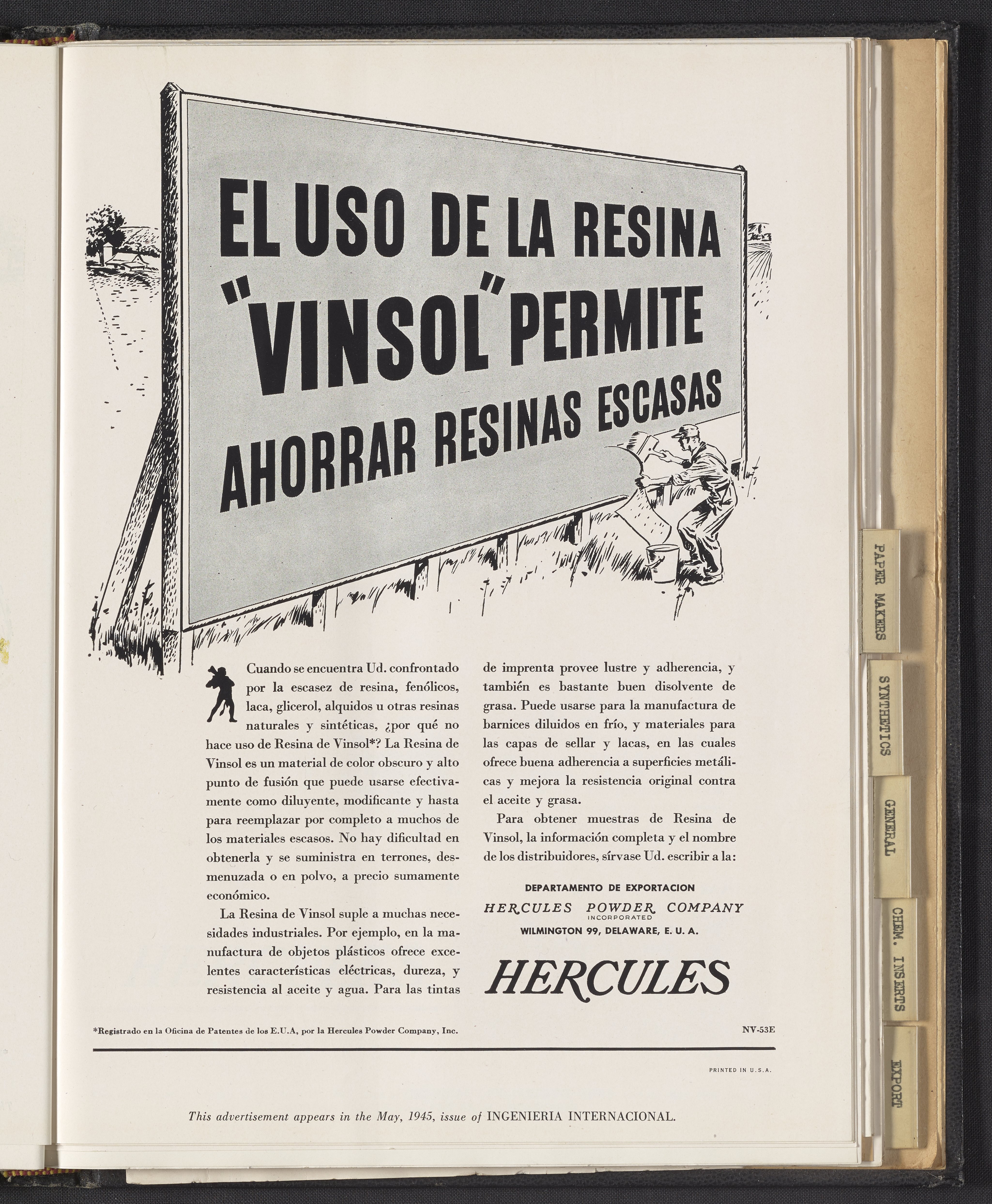 Hercules Incorporated. “El Uso De La Resina ‘Vinsol’ Permite Ahorrar Resinas Escasas.” 1945 Hercules Advertisements, 1945. Records of Hercules Incorporated, Volume 1945. Science History Institute. Philadelphia. https://digital.sciencehistory.org/works/k643b199d.