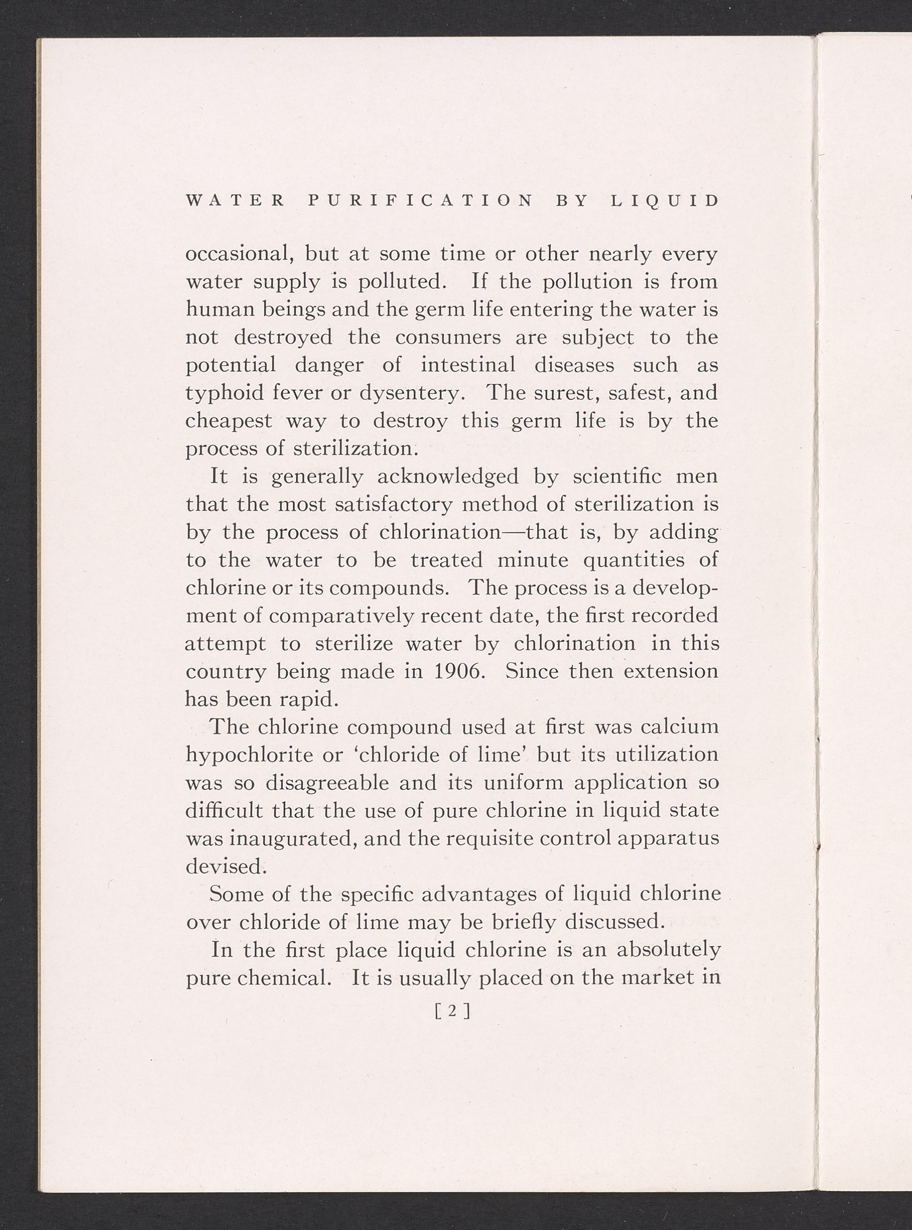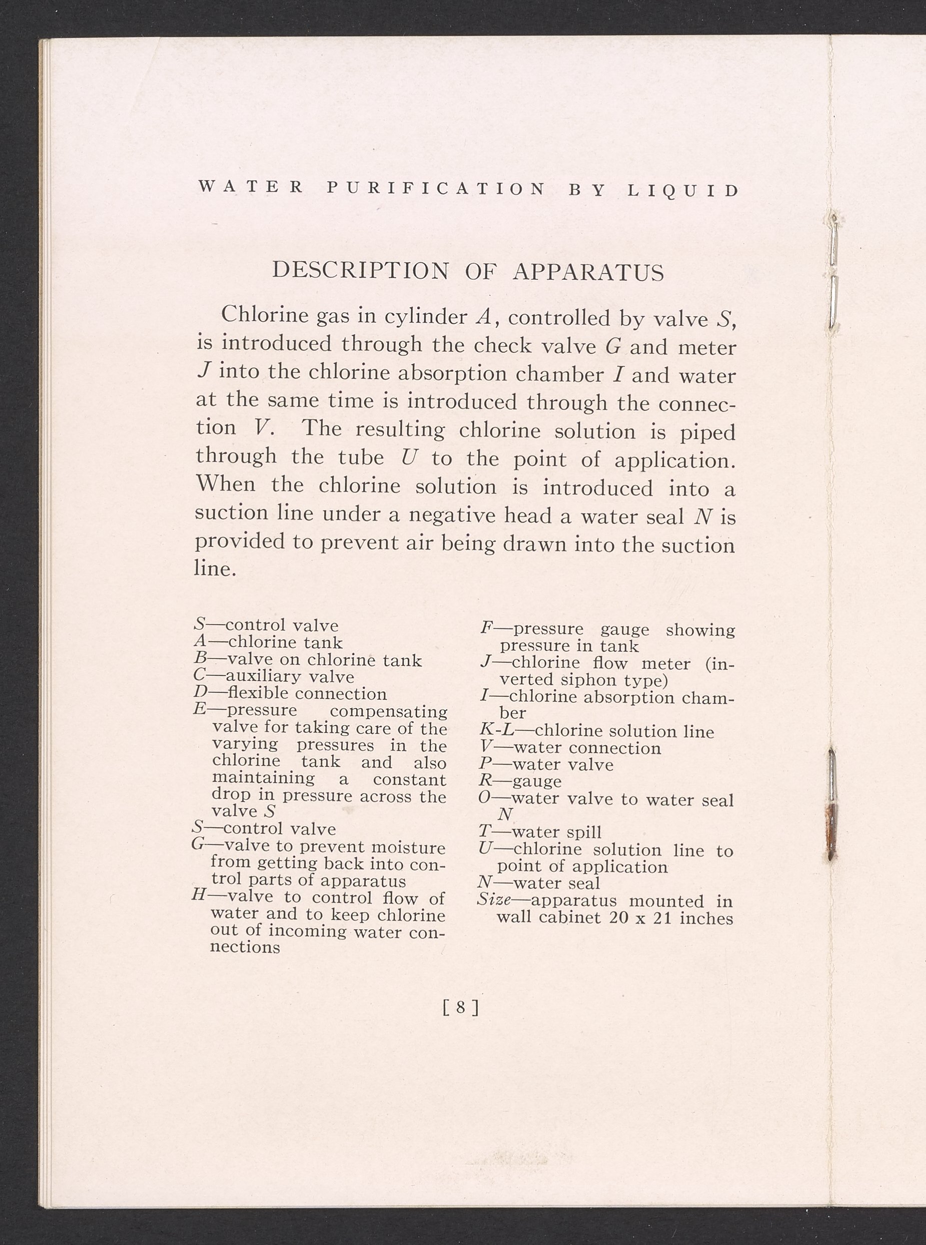 Small JPG1200 x 1731px — 362 KBFull-sized JPG1725 x 2488px — 711 KBOriginal fileTIFF — 1725 x 2488px — 12.3 MBTechnical publication pamphlet providing information regarding the Wallace & Tiernan Co., Inc. manual control chlorinator apparatus. Discusses the sterilization of water by chlorination and the advantages of using liquid chlorine for this purpose. The majority of the publication describes the mechanical construction and technical specifications of the control chlorinator apparatus. Includes diagrams of the apparatus and a photographic print. The work is digitized in its entirety.