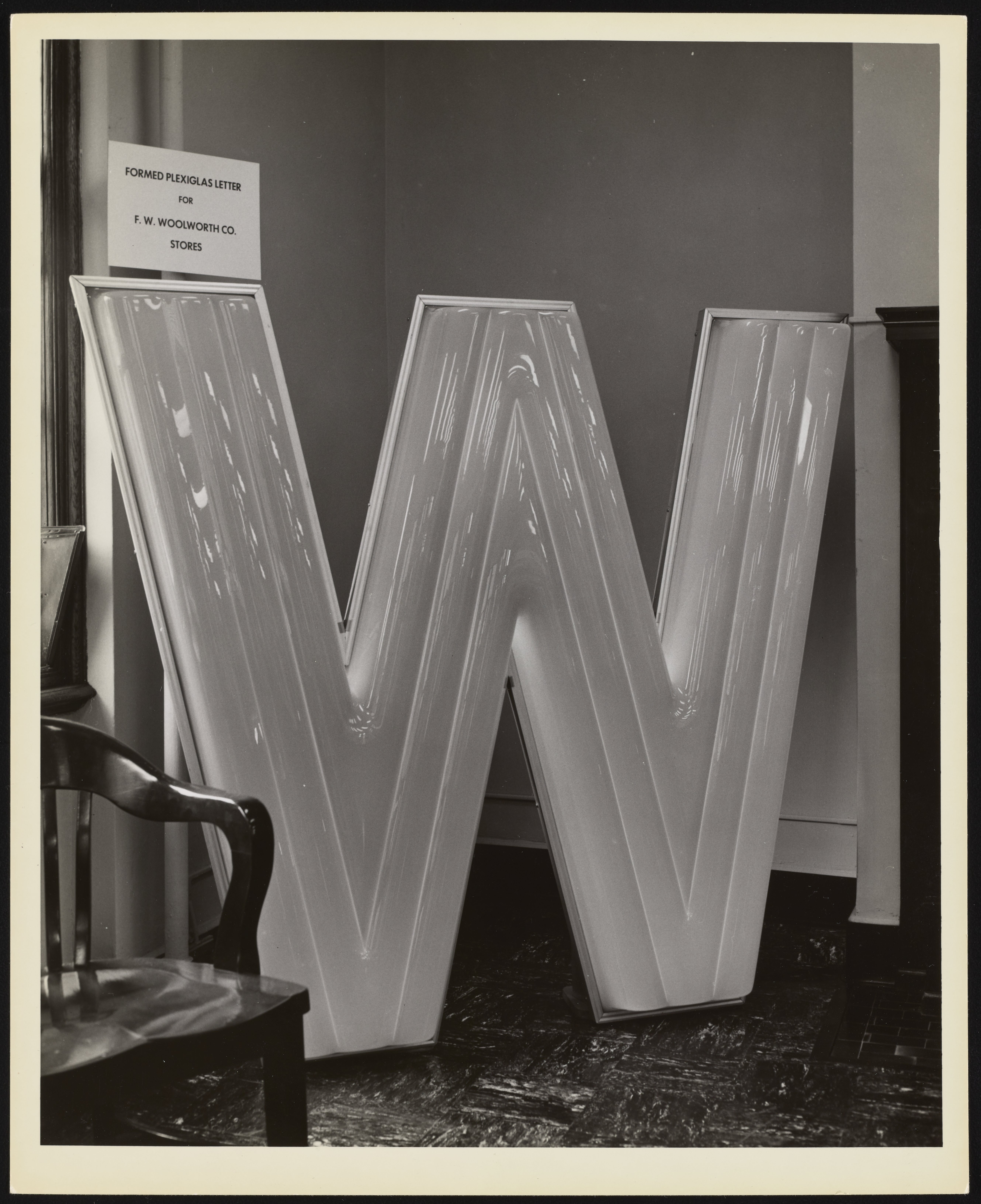 Rohm and Haas Company. “Formed Plexiglas Letter for F.W. Woolworth Co. Stores,” April 19, 1956. Rohm & Haas Company Archives, Box Photos 20, Folder 28. Science History Institute. Philadelphia. https://digital.sciencehistory.org/works/k7bw3mu.
