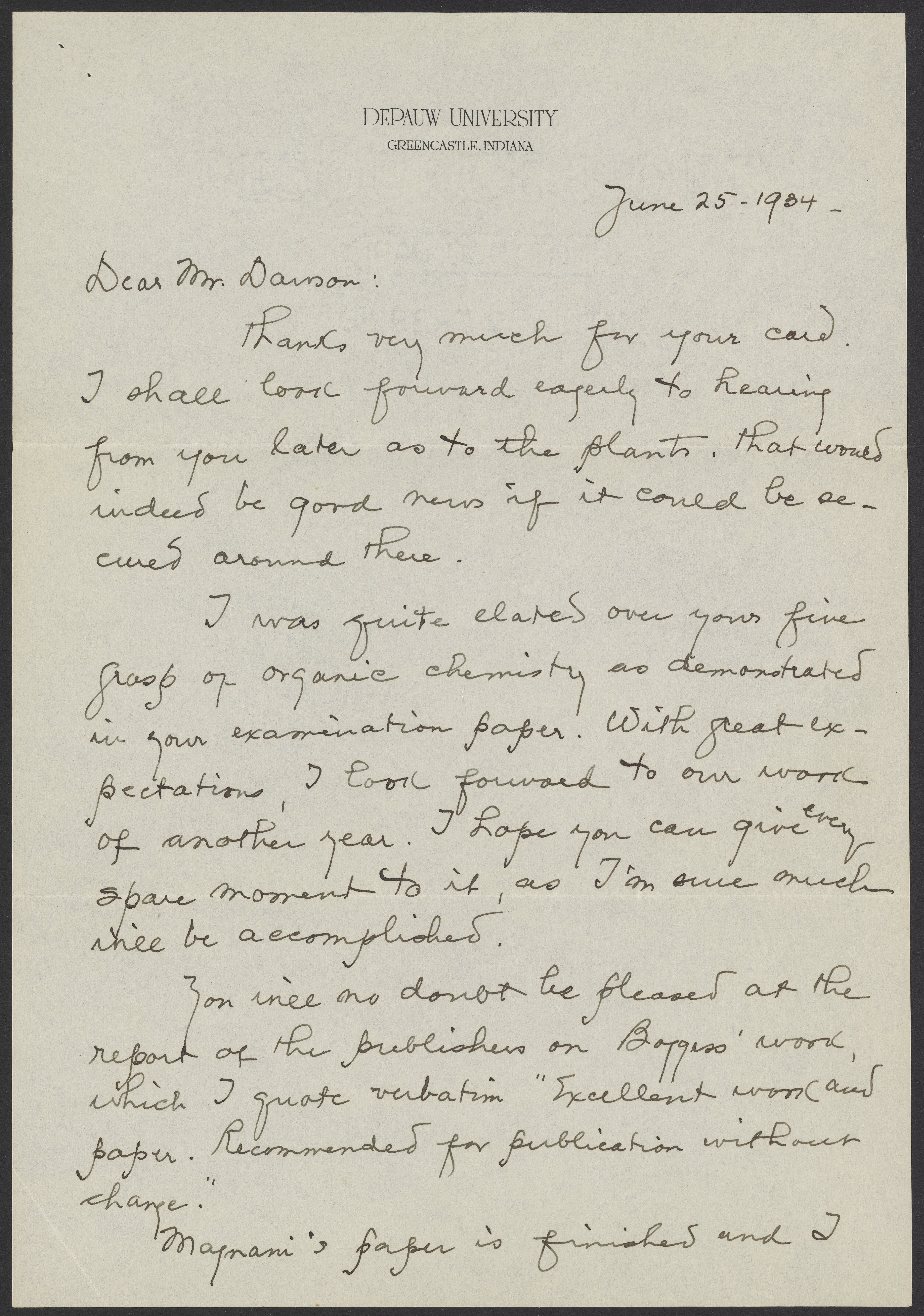 Small JPG1200 x 1709px — 303 KBLarge JPG2880 x 4101px — 1.9 MBFull-sized JPG4598 x 6548px — 4.7 MBOriginal fileTIFF — 4598 x 6548px — 86.2 MBPercy Julian (1899-1975) writes to his student, Ray Fields Dawson (1911-2012) to express his pleasure at Dawson's excellent performance in organic chemistry. He notes upcoming student publications and hopes that next year he and Dawson can co-author a paper.