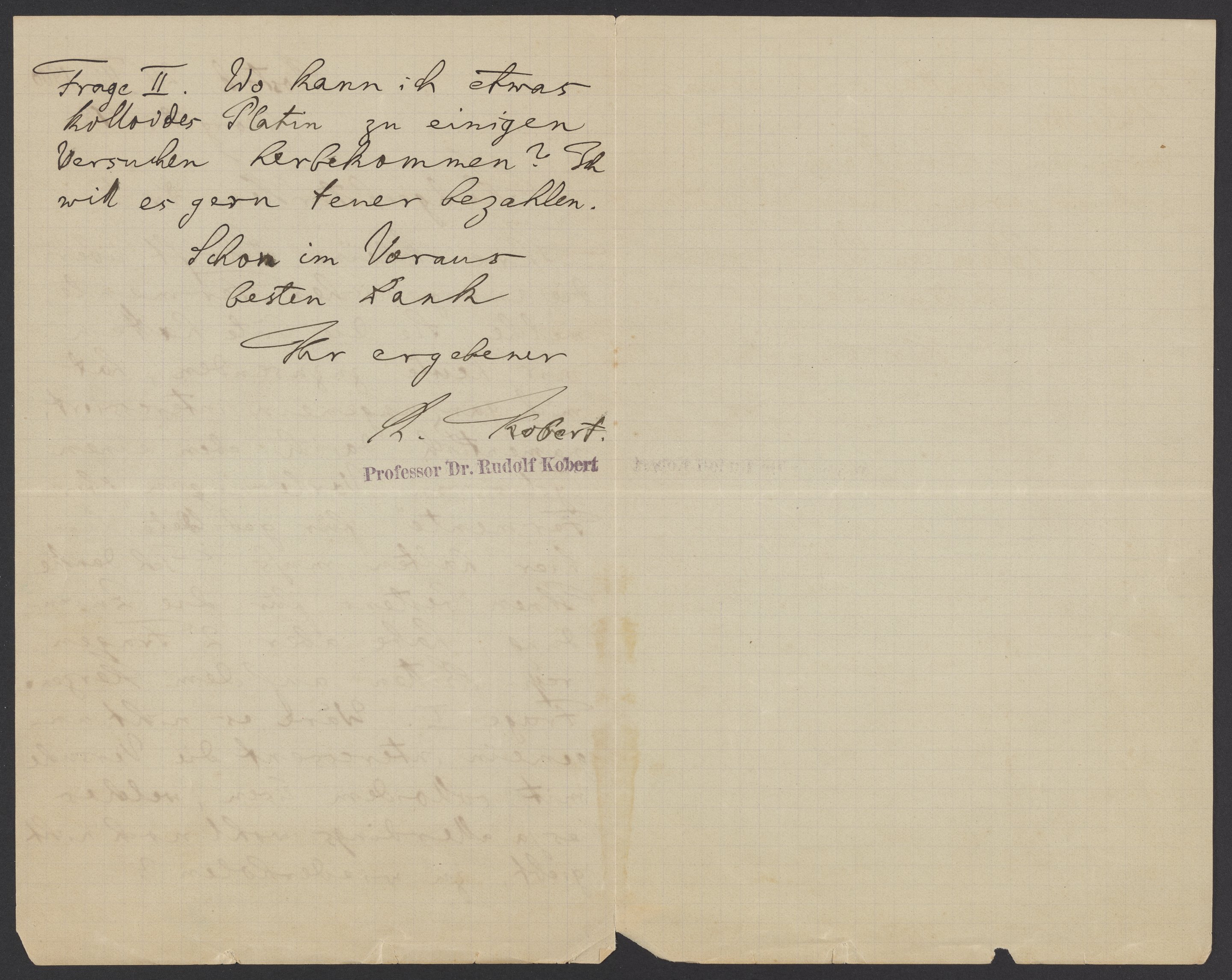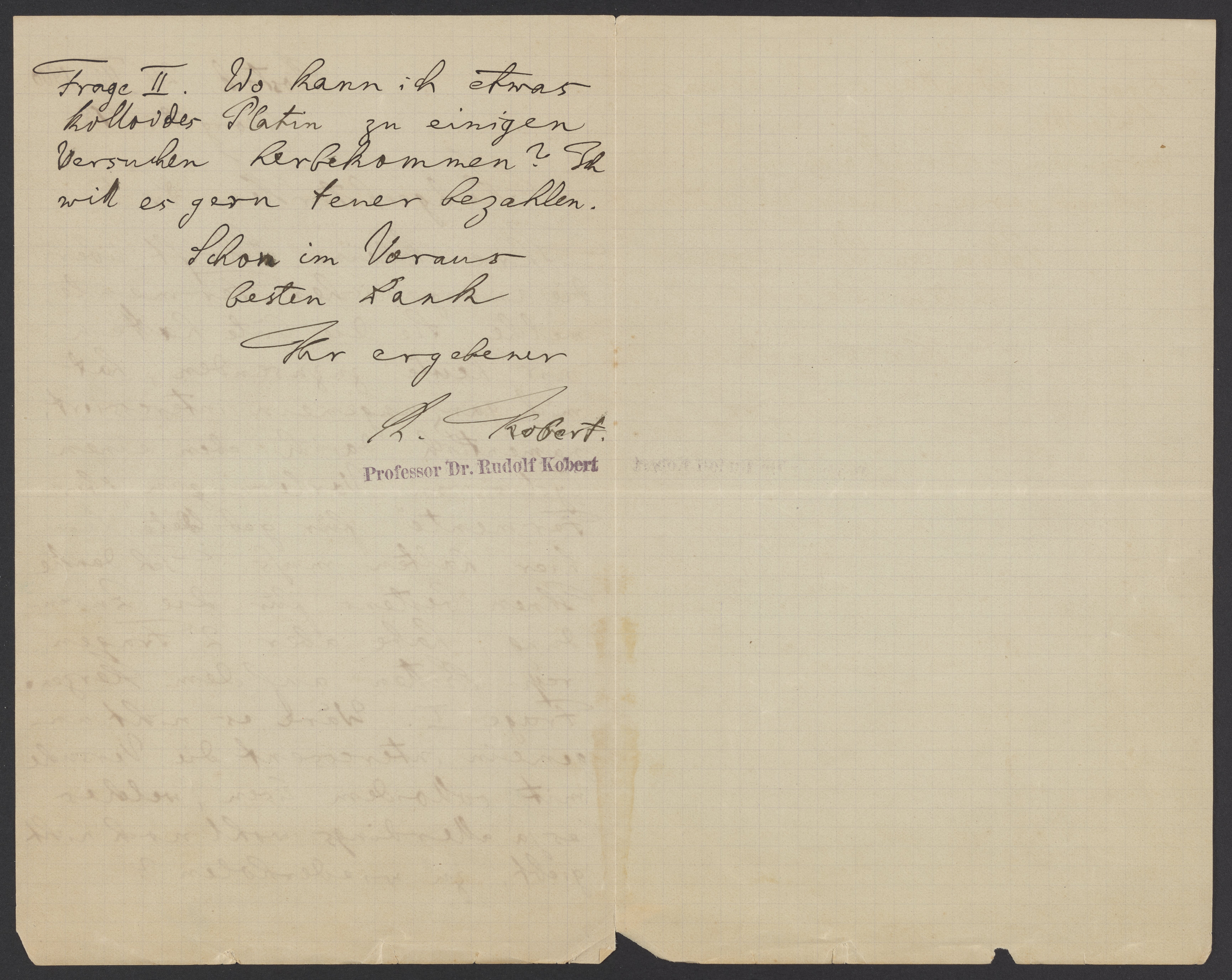 Frage II. Wo kann ich etwas kolloides Platin zu einigen Versuchen herbekommen? Ich will es gern ferner bezahlen.