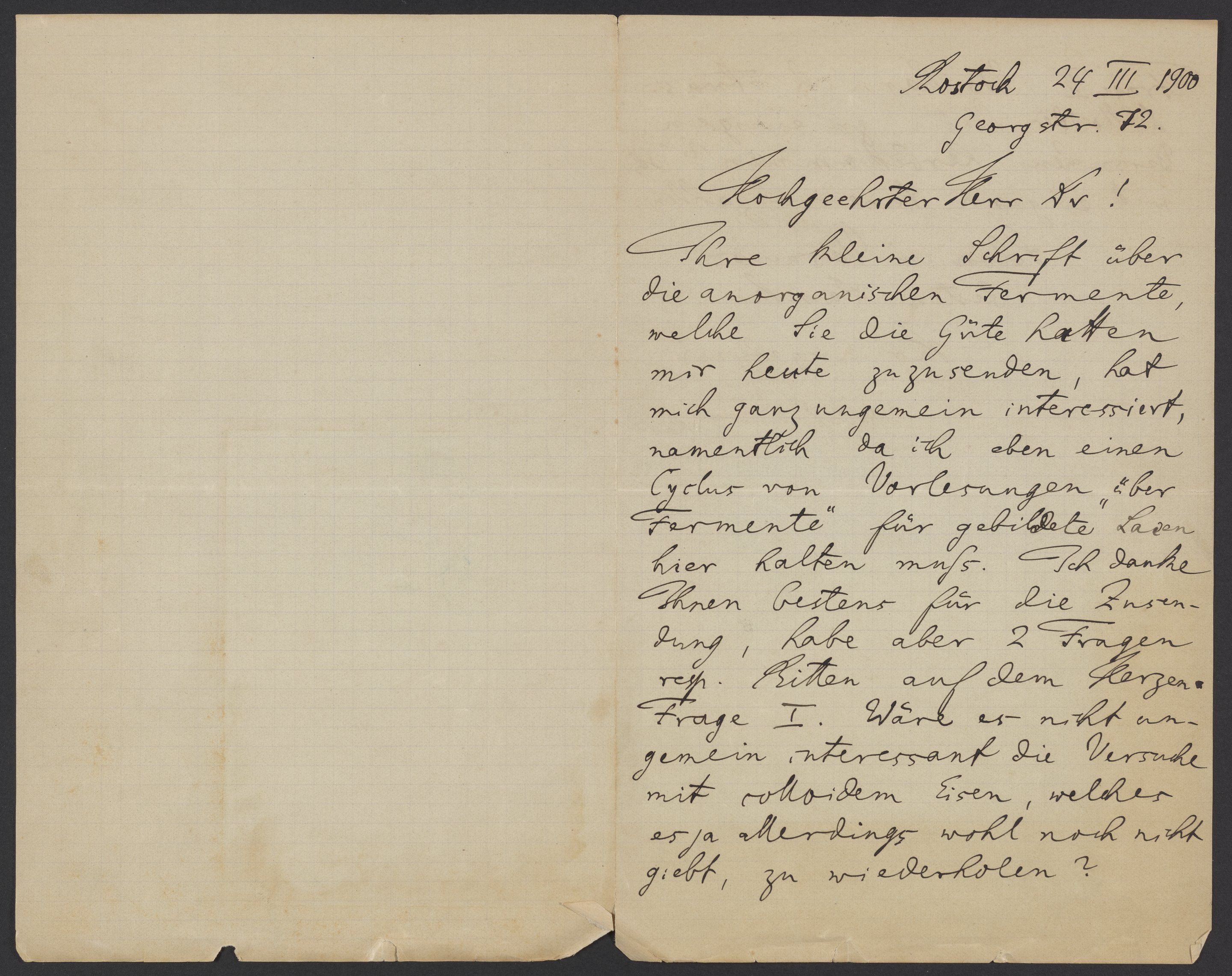 Ihre kleine Schrift über die anorganischen Fermente, welche Sie die Güte hatten mir heute zuzusenden, hat mich ganz ungemein interessiert, namentlich da ich eben einen Cyclus von Vorlesungen „Über Fermente“ für gebildete Laden hier halten muss. Ich danke Ihnen bestens für die Zusendung, habe auch 2 Fragen. recht Bitten auf dem Herzen.