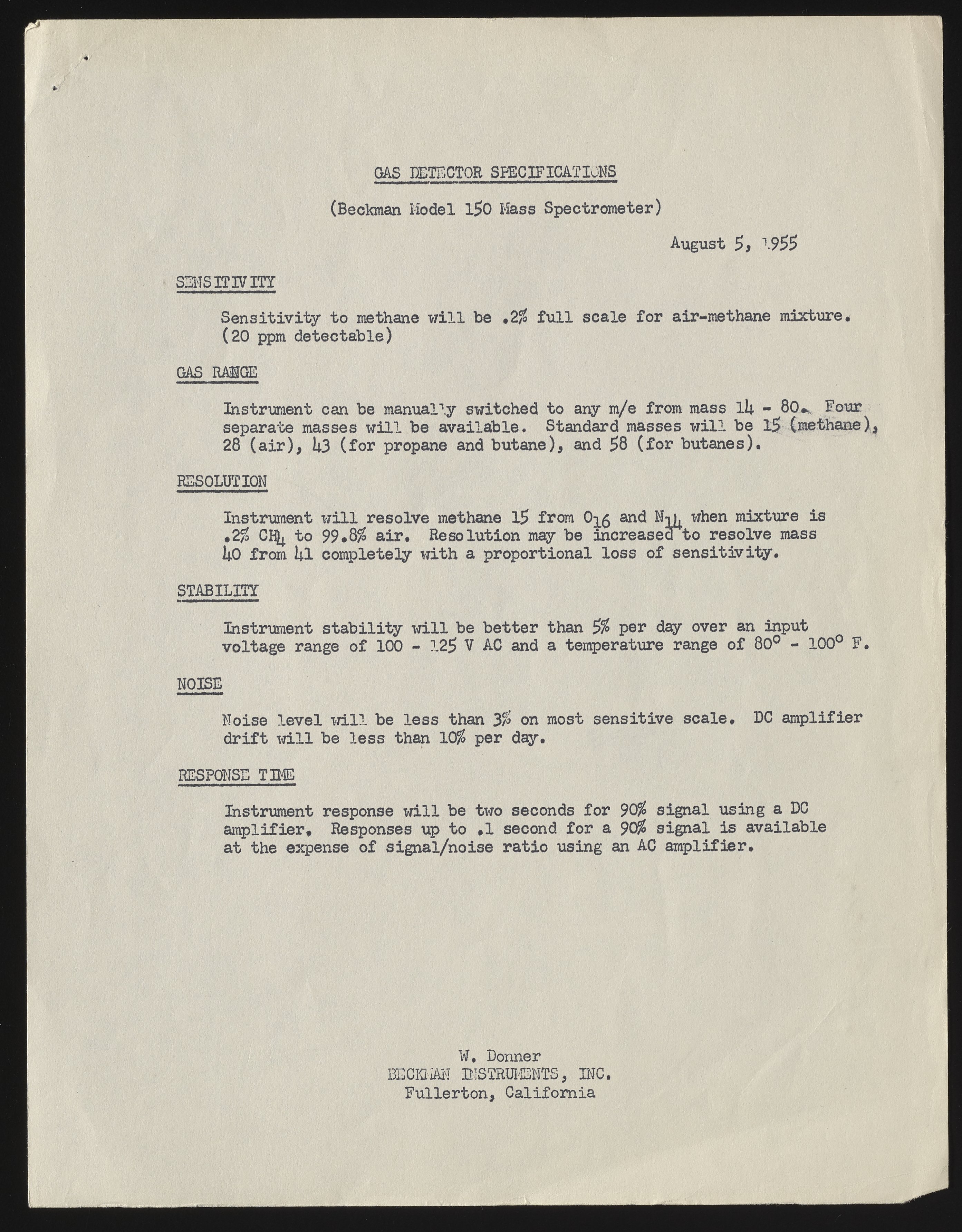 Gas Detector Specifications (Beckman Model 150 Mass Spectrometer)