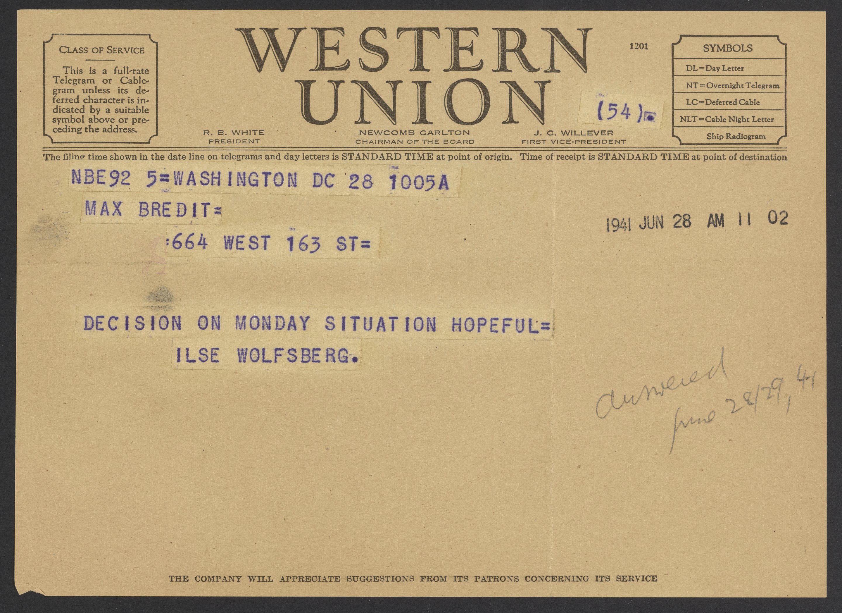Telegram from Ilse Wolfsberg to Max Bredig, June 28, 1941