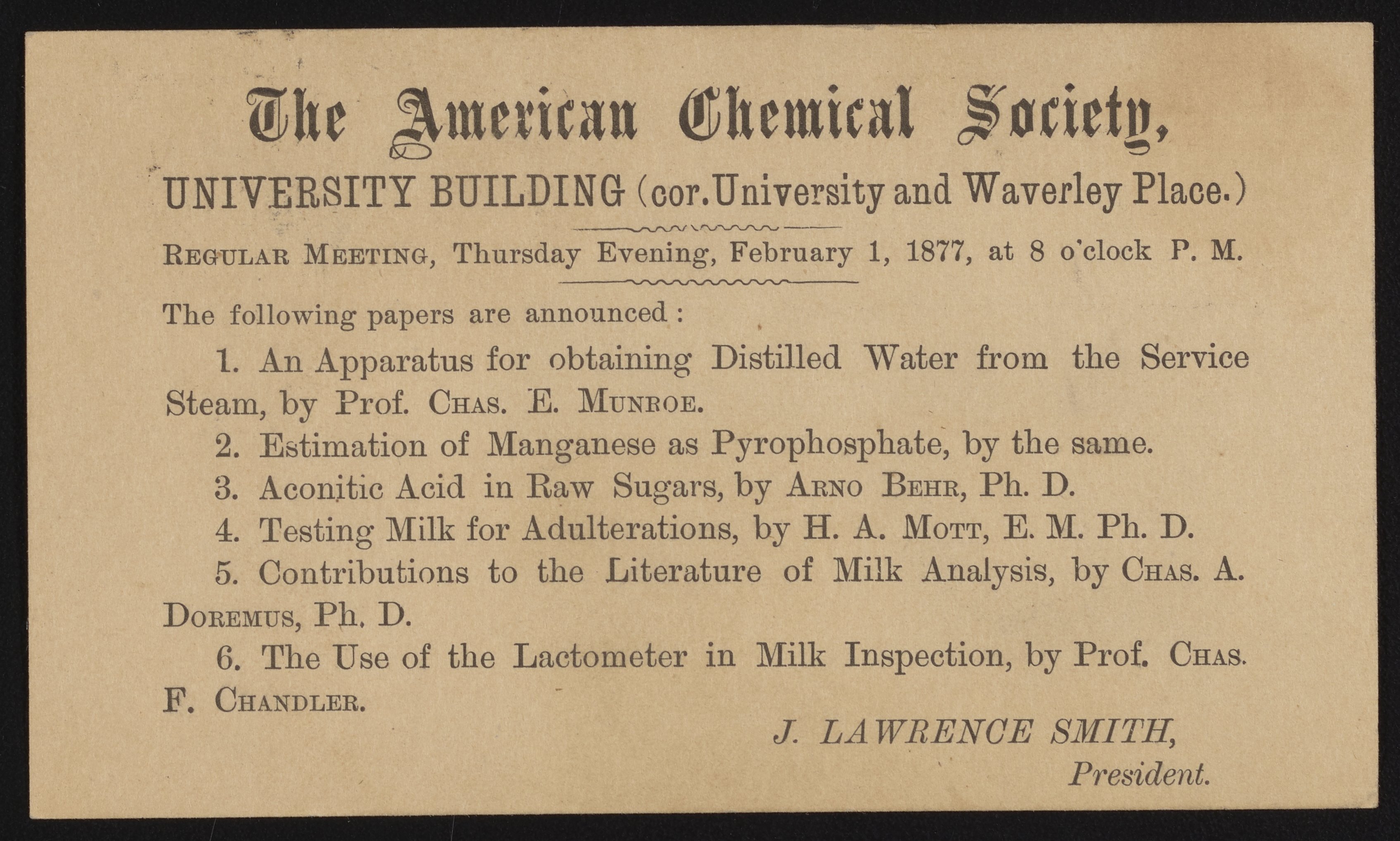 Small JPG1200 x 723px — 150 KBLarge JPG2880 x 1736px — 704 KBFull-sized JPG3376 x 2035px — 914 KBOriginal fileTIFF — 3376 x 2035px — 19.7 MBAn invitation to James Curtis Booth (1810-1888) from the American Chemical Society for their regular meeting, during which a selection of papers are intended to be announced.