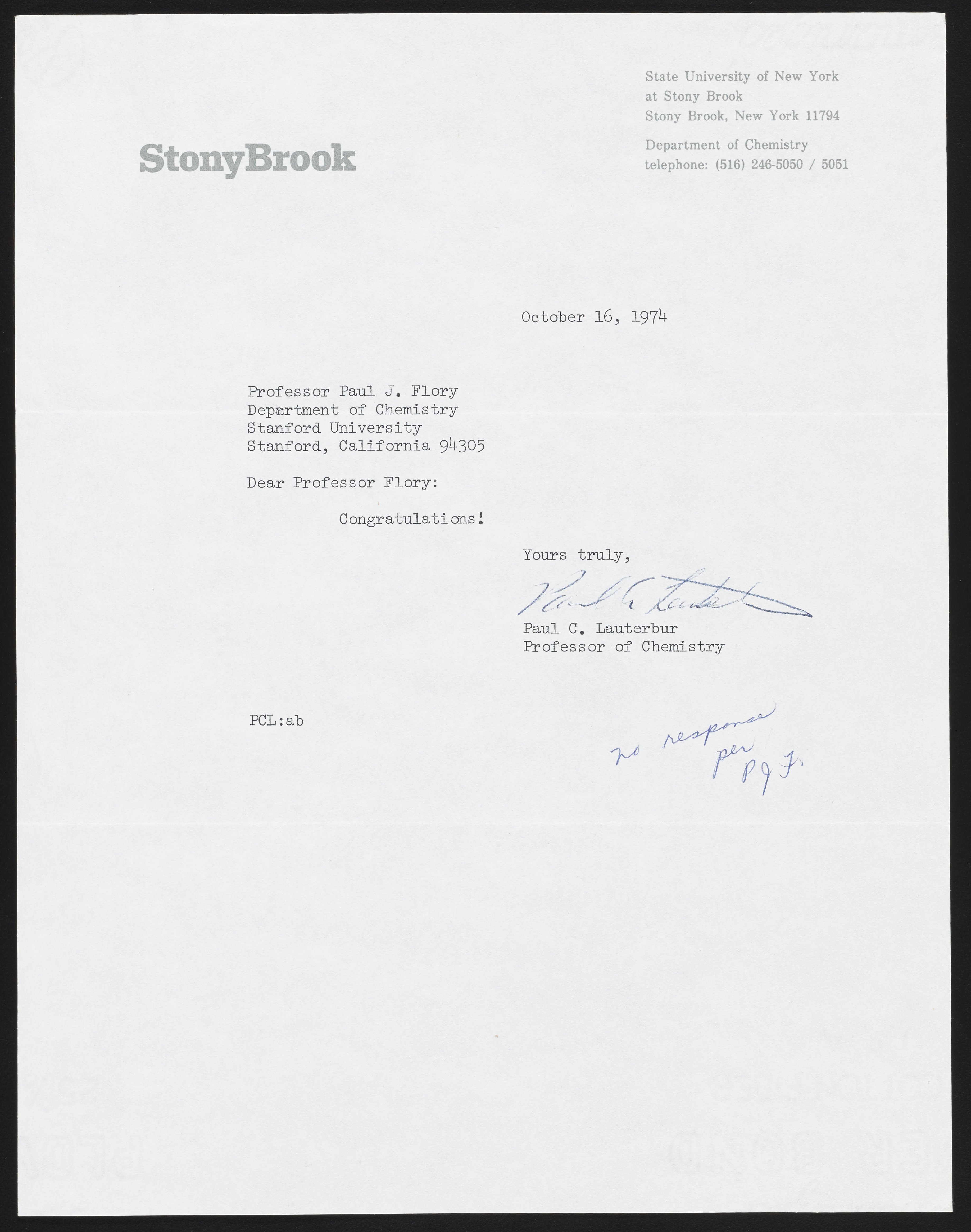 Letter from Paul Lauterbur to Paul Flory